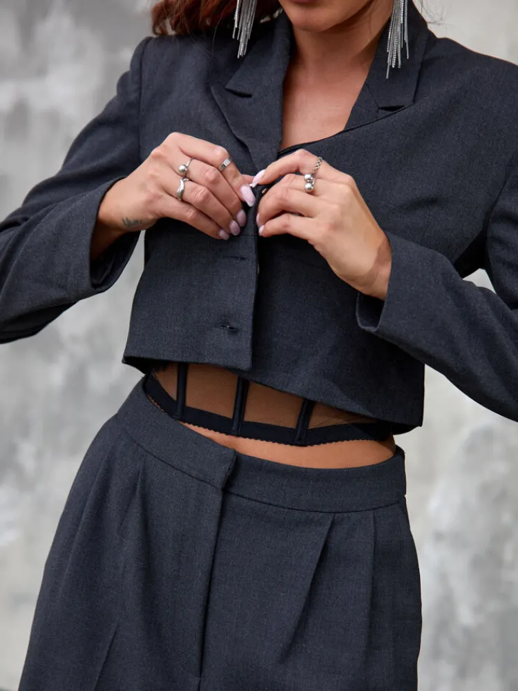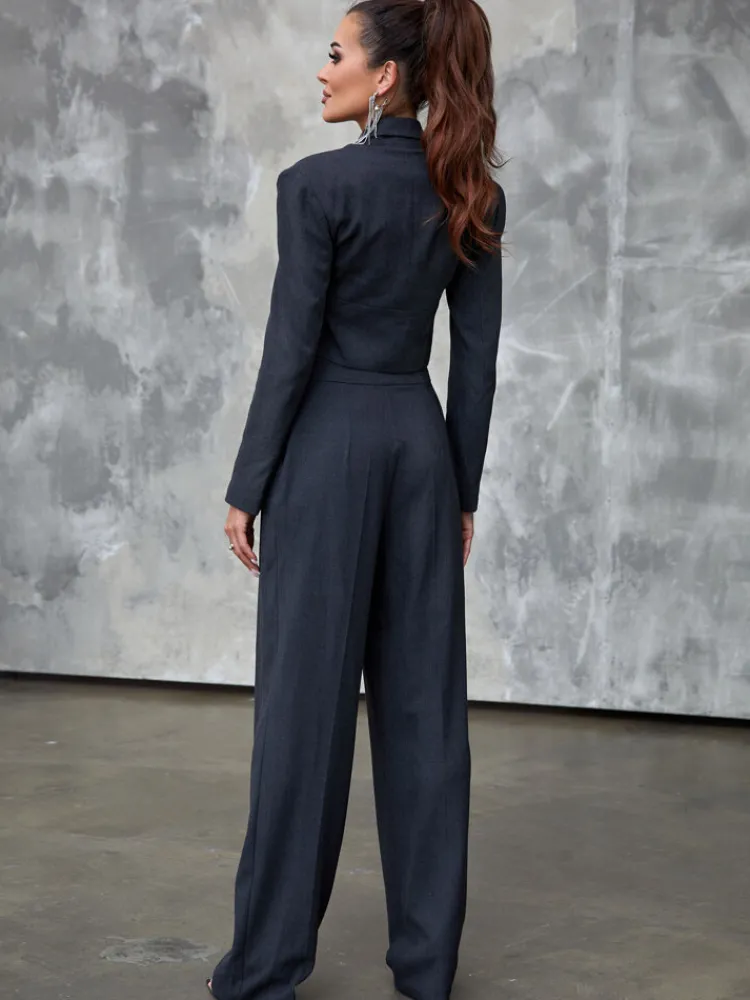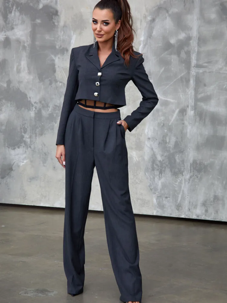 Wykonany z wysokiej jakości materiału garnitur, składający się z dwóch elementów to idealna propozycja dla kobiet podążających za najnowszymi trendami. Spodnie charakteryzuje najmodniejszy fason wide leg. Posiadają dwie kieszenie i delikatnie podwyższony stan. Całość dopełnia marynarka o krótkim kroju, której niepowtarzalnego wyglądu dodają trzy, srebrne guziki. Obłędnie prezentuje się zarówno w zestawie jak i osobno.