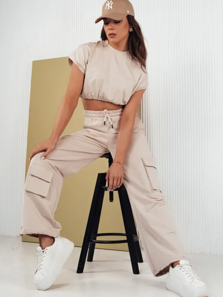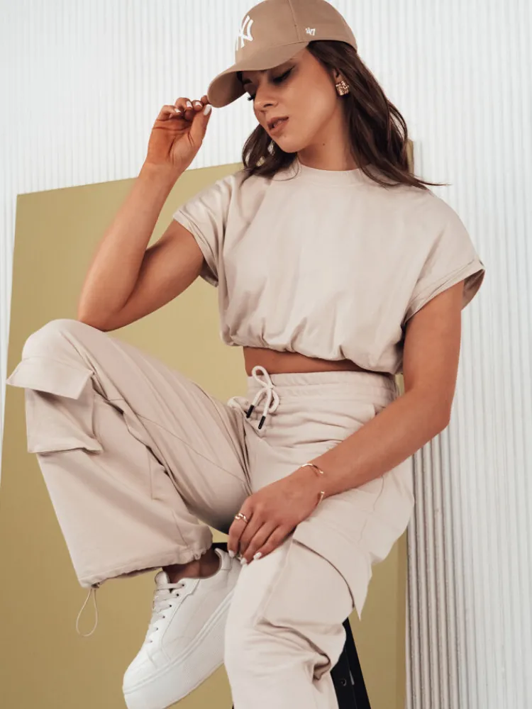 Komplet MALANS to synonim miejskiej elegancji w casualowym wydaniu. Przyjemny w noszeniu krótki top w zestawieniu z luźnymi spodniami z regulowanymi ściągaczami stworzy Twoją nową ulubioną stylizację. Spodnie, z kieszenią cargo i ozdobną naszywką, są gotowe podkreślić Twój indywidualizm i dodają odrobinę awangardy do codziennego looku.