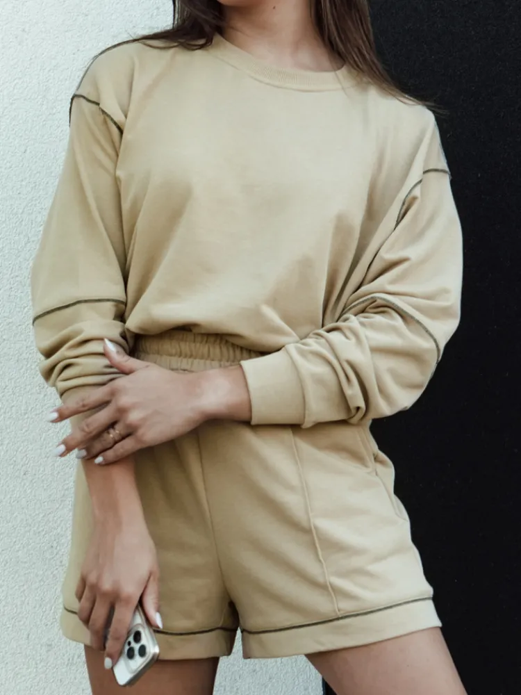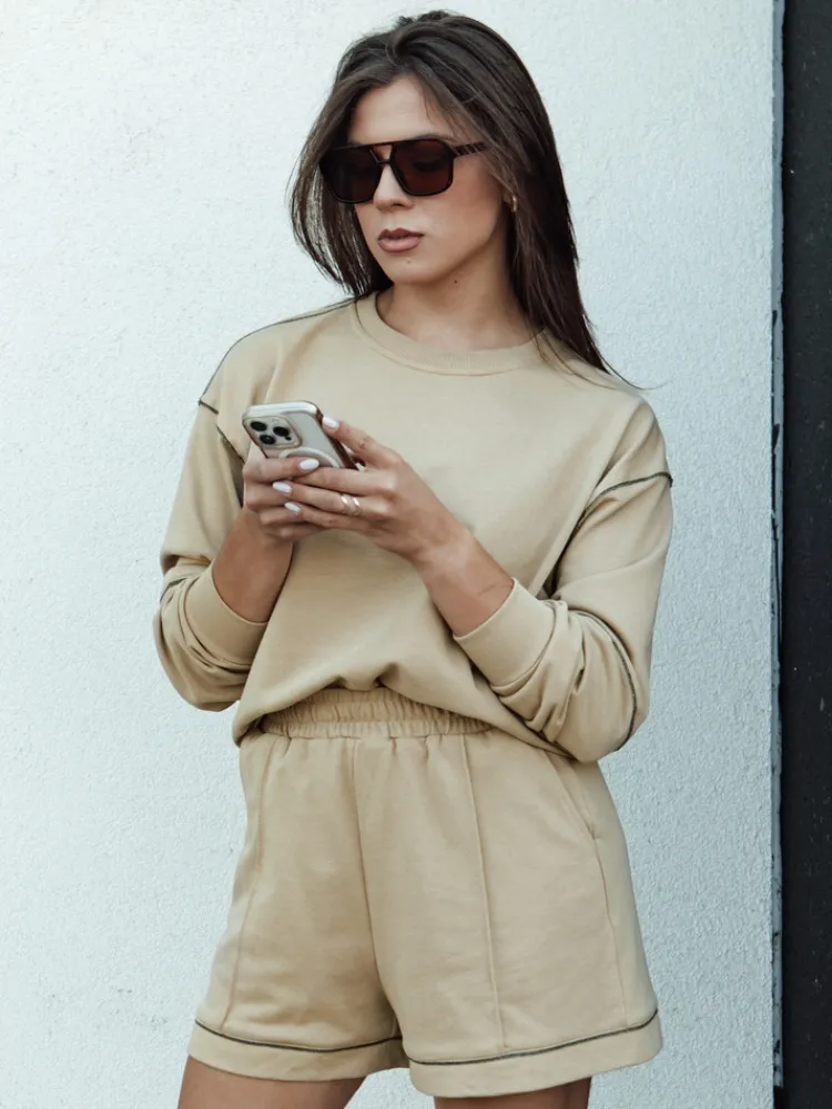 Komplet dresowy, który przyciąga uwagę niepowtarzalnym designem. Luźna bluza z oryginalnymi przeszyciami łączy komfort z unikalnym stylem, a krótkie spodenki podkreślają swobodny charakter zestawu. Idealny do noszenia w domu lub na casualowe wyjścia, zapewniając wygodę i swobodę.