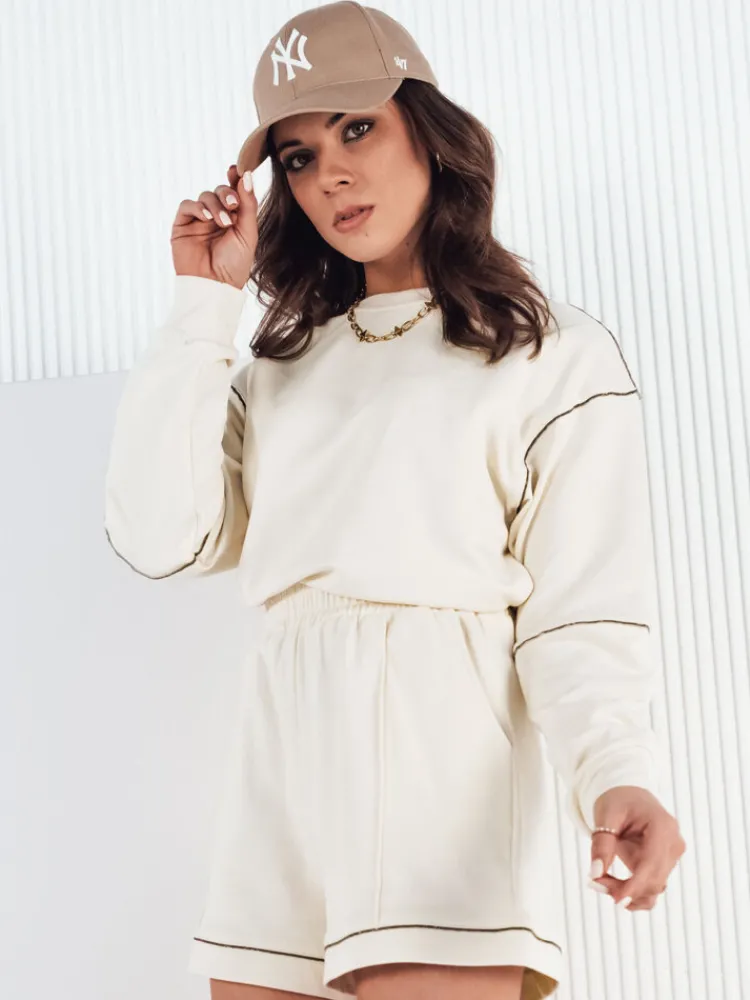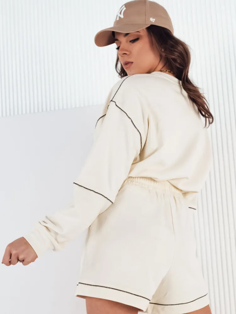 Komplet dresowy, który przyciąga uwagę swoim niepowtarzalnym designem. Luźna bluza z oryginalnymi przeszyciami to połączenie komfortu z unikalnym stylem, a krótkie spodenki podkreślają swobodny charakter zestawu. Idealny do noszenia w domu lub na casualowe wyjścia, gwarantujący wygodę i swobodę.