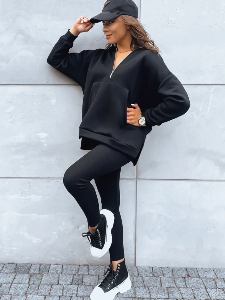 - Wszechstronność – Komplet składający się z bluzy o kroju oversize oraz dopasowanych, prążkowanych legginsów oferuje szerokie możliwości stylizacyjne. Noszony zarówno w zestawie, jak i osobno, zawsze prezentuje się stylowo.