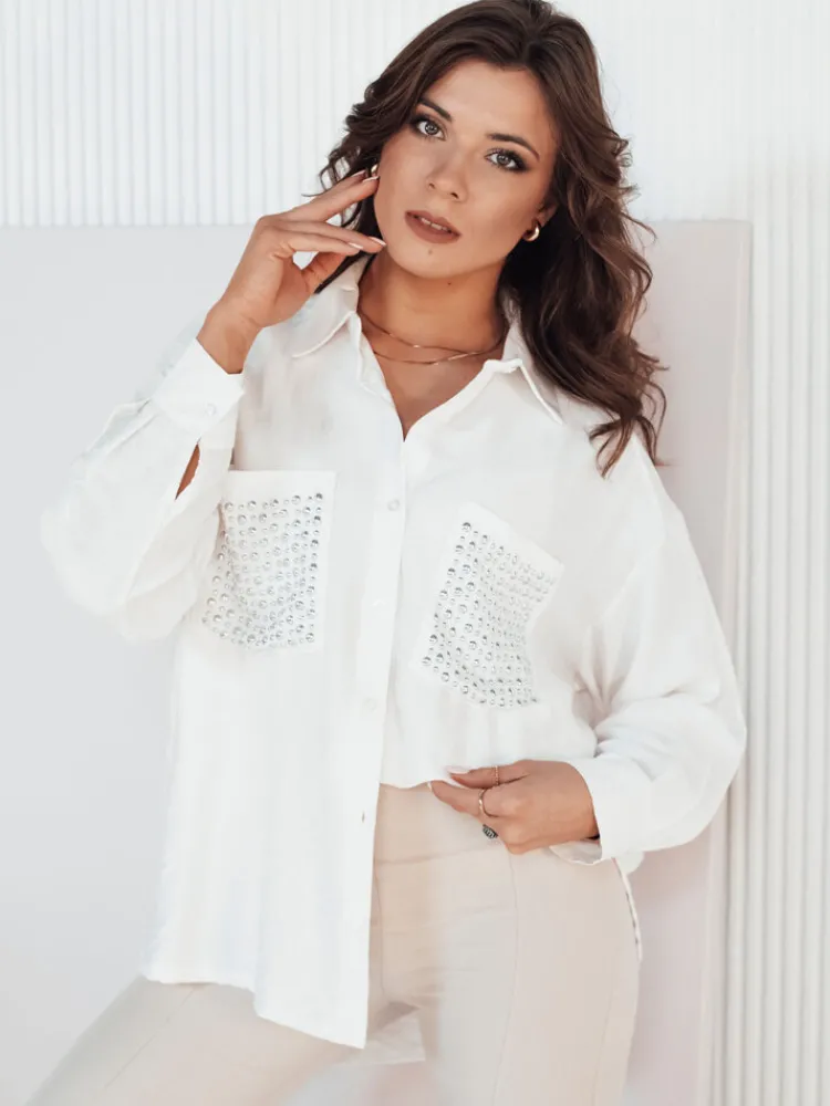 Ta stylowa koszula o długim kroju łączy w sobie luz i wygodę z eleganckimi detalami. Kieszenie na piersi z ozdobnymi cekinami nadają jej unikalnego charakteru, a klasyczny kołnierz i guziki to ponadczasowe elementy, które nigdy nie wychodzą z mody.
