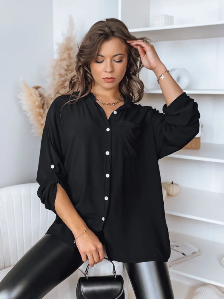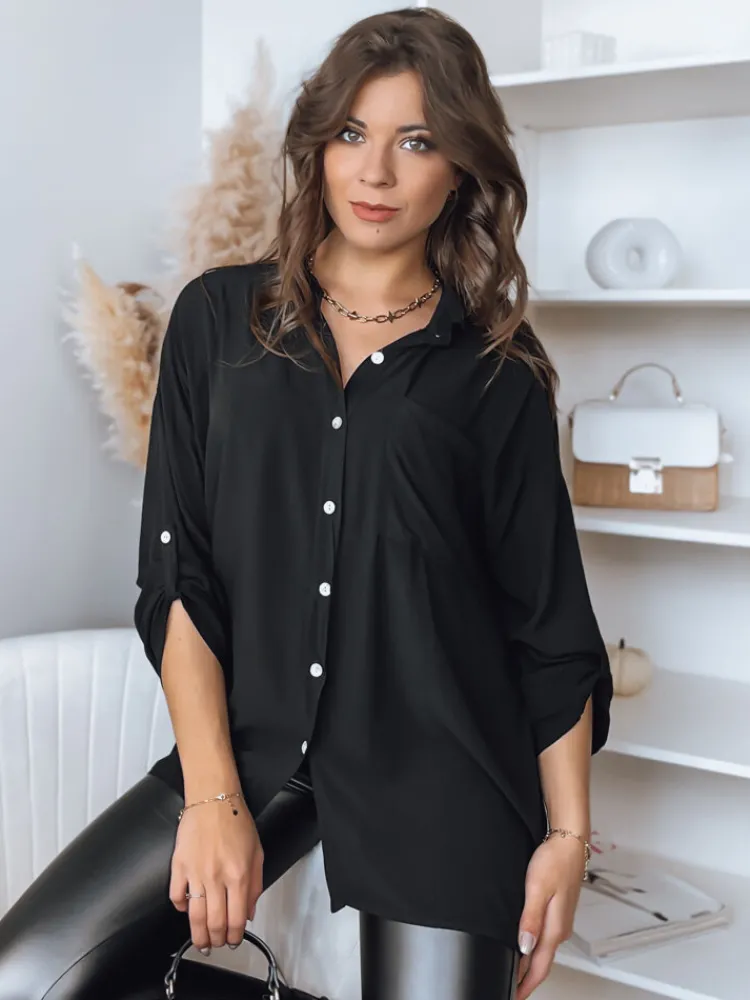Oversize’owa koszula o asymetrycznym kroju to niezbędnik w szafie każdej kobiety. Posiada zapinanie na guziki, rękawy z możliwością ich podpięcia oraz kieszonkę na wysokości piersi. Wykonana została z wysokiej jakości ,,lejącego się” materiału, dzięki czemu świetnie układa się na ciele. Bezbłędnie sprawdzi się zarówno w casualowych jak i eleganckich zestawieniach.