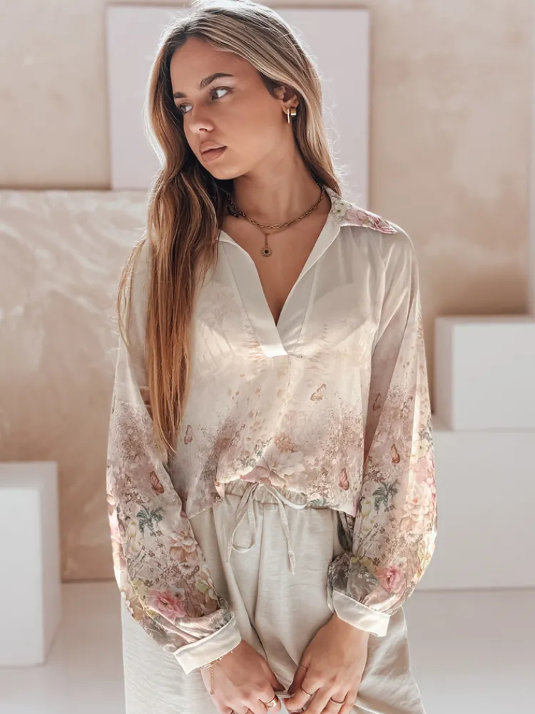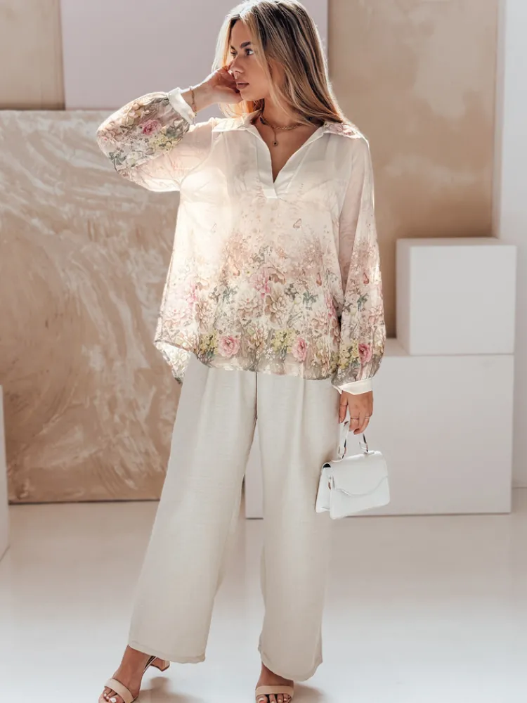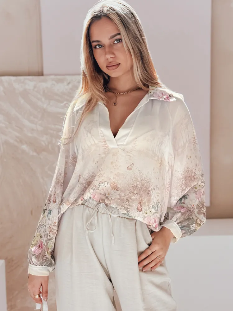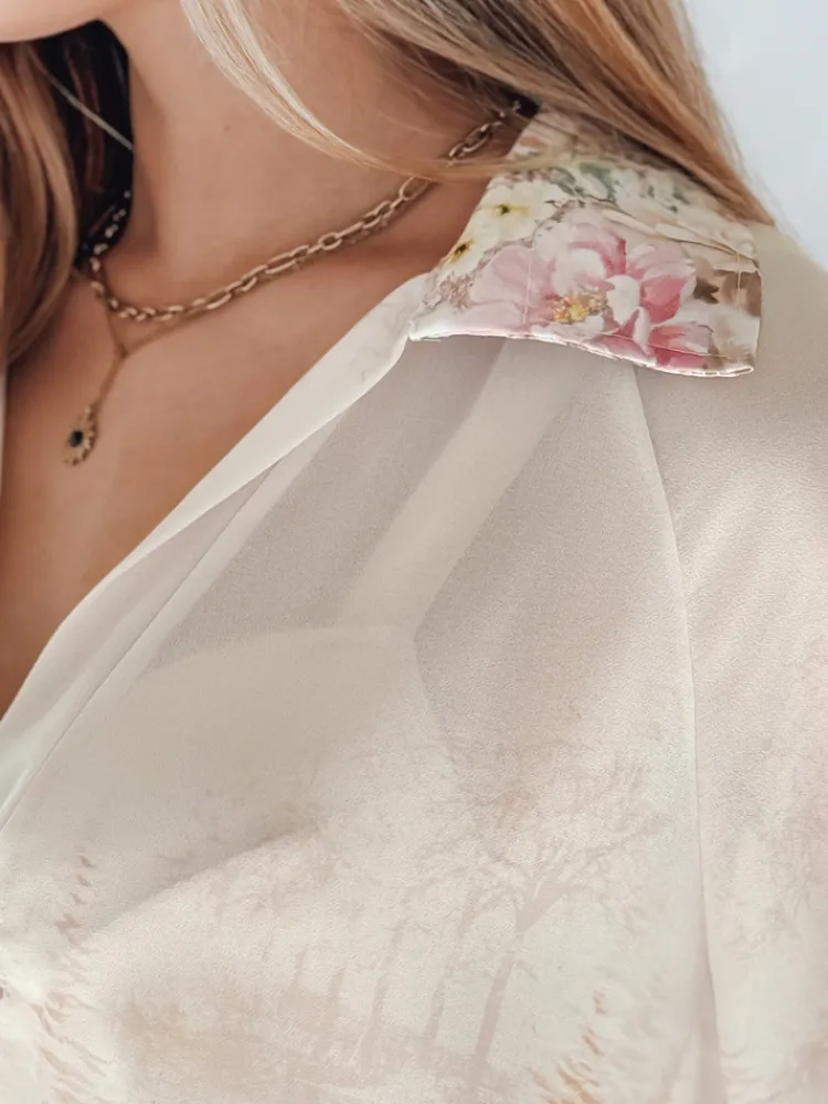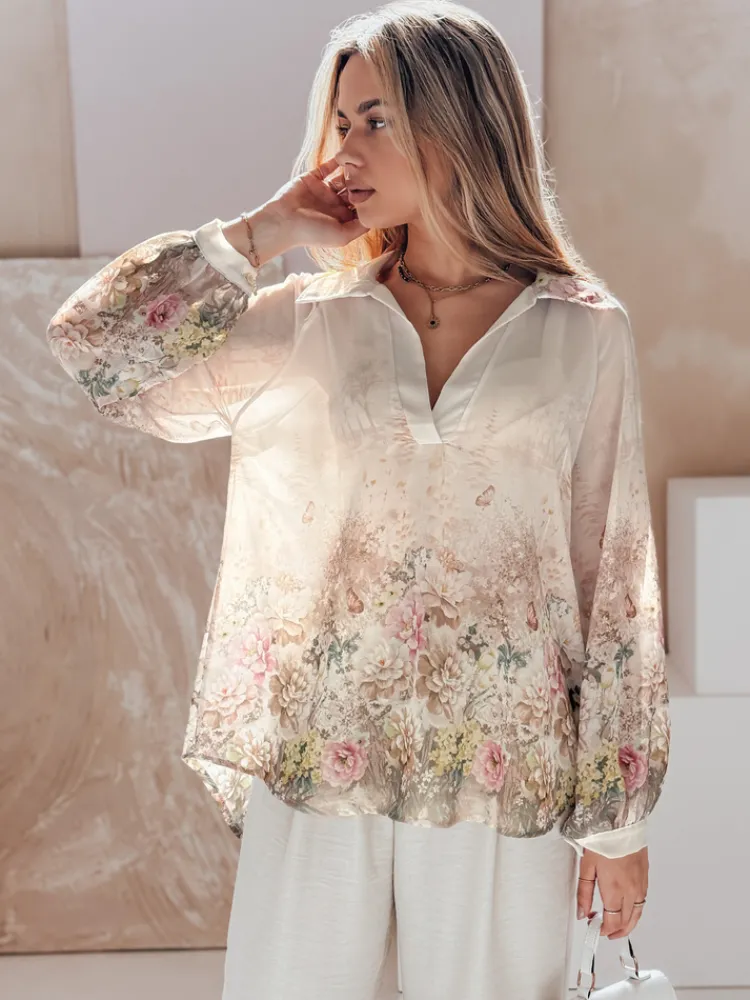 Lekka i przewiewna koszula damska oversize z wyjątkowym kwiatowym printem, który przyciąga spojrzenia. Uniwersalny rozmiar pasuje od XS do L. Wykonana z cienkiego, półprzezroczystego materiału, który delikatnie otula sylwetkę. Dłuższy tył subtelnie wydłuża sylwetkę. Model typu one size z głębokim dekoltem w serek, długimi rękawami zakończonymi mankietami zapinanymi na guziki. Sprawdzi się zarówno do stylizacji codziennych, jak i na wyjścia.