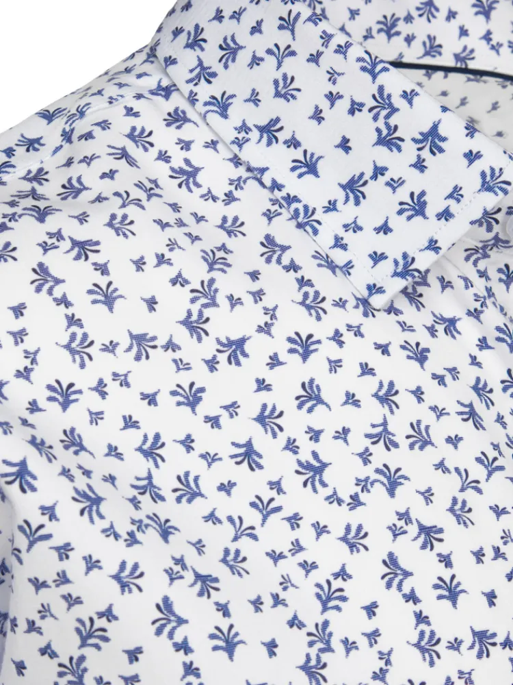 Casualowa koszula męska z długim rękawem i eleganckim, botanicznym wzorem to świetna propozycja na cieplejsze dni. Fason slim fit podkreśla sylwetkę oraz zapewnia nowoczesny wygląd. Subtelny nadruk dodaje jej charakteru, a klasyczny kołnierzyk wraz z mankietem z regulacją sprawiają, że pasuje zarówno do stylizacji półformalnych, jak i codziennych.