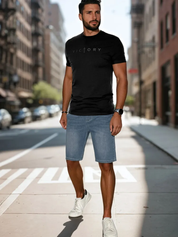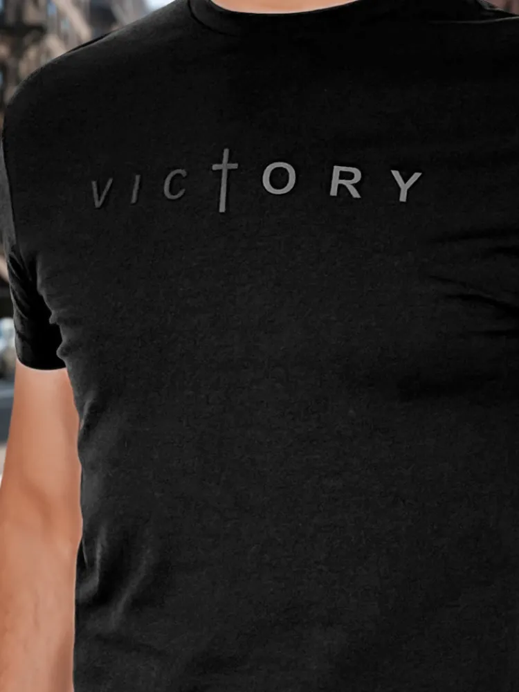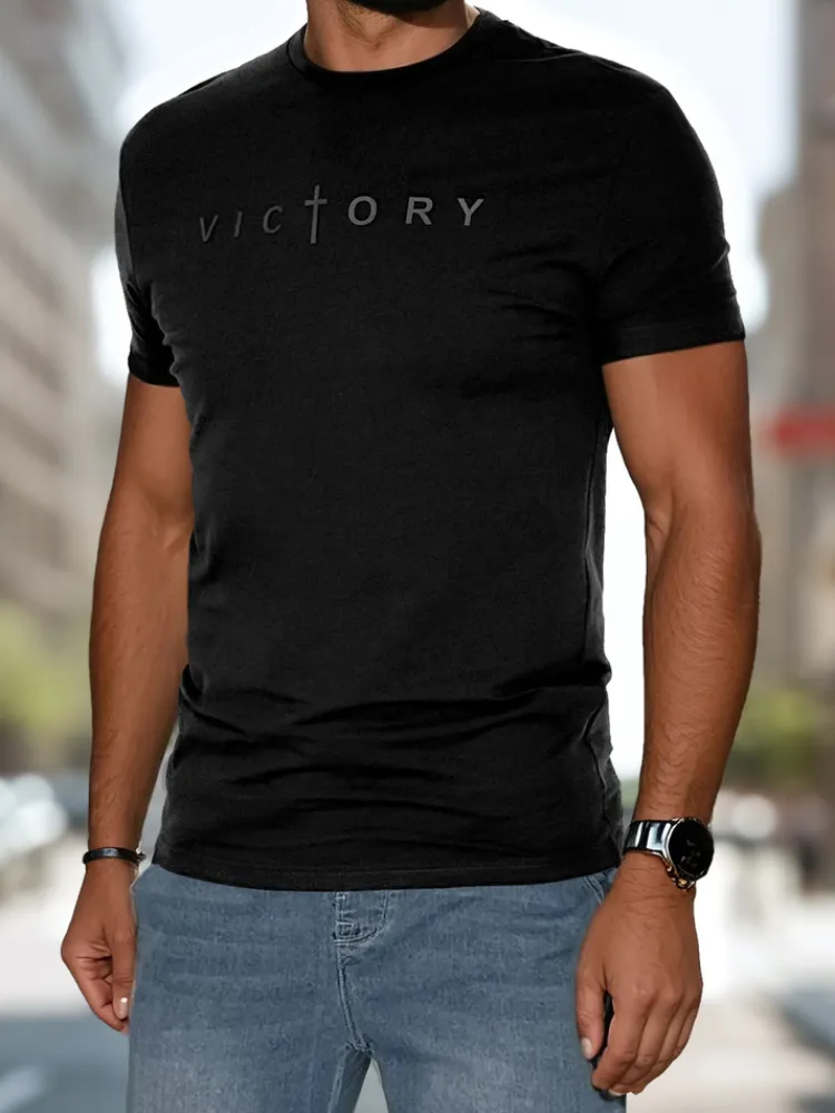Męski t-shirt z krótkim rękawem i klasycznym okrągłym dekoltem to idealna propozycja dla fanów minimalistycznych, ale wyrazistych stylizacji. Z przodu znajduje się nadruk z napisem „VICTORY”, w którym litera „T” została zastąpiona symbolem krzyża, co dodaje mu unikalnego charakteru. Koszulka sprawdzi się zarówno na co dzień, jak i w stylizacjach casualowych z jeansami lub szortami.