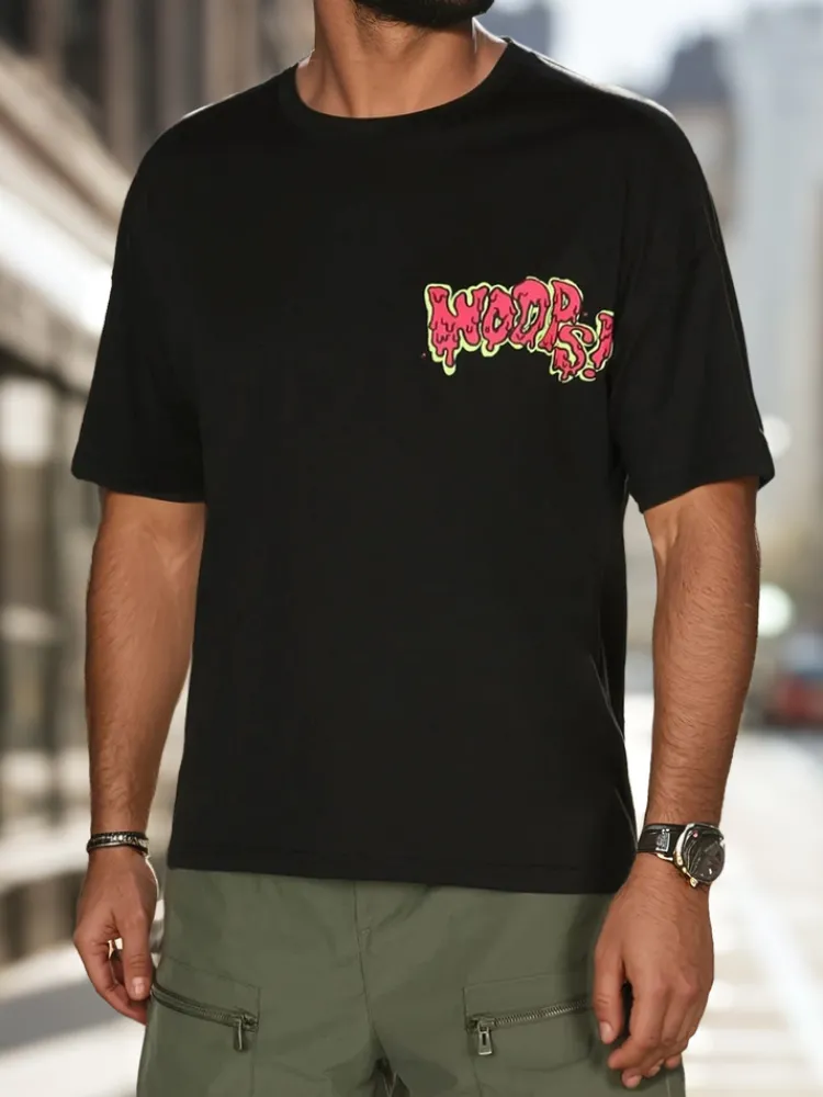 Męska koszulka t-shirt o luźnym kroju, idealna na co dzień i wpisująca się w miejski styl. Wyróżnia się kontrastowym nadrukiem z przodu oraz dużą grafiką graffiti na całych plecach, która przyciąga wzrok oraz nadaje streetwearowego charakteru. Klasyczny, okrągły dekolt zapewnia wygodę, a przewiewny materiał sprawia, że model świetnie sprawdza się w sezonie wiosennym.