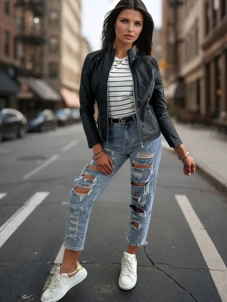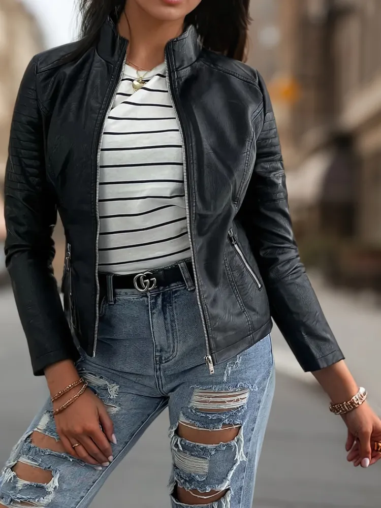 Klasyczna ramoneska, która dopełni każdą codzienną jak i bardziej wymagającą stylizację. Kurtka posiada stójkę oraz dwie kieszenie zapinane na suwak. Delikatne taliowanie sprawia, że sylwetka optycznie się wysmukla. MUST HAVE sezonu!