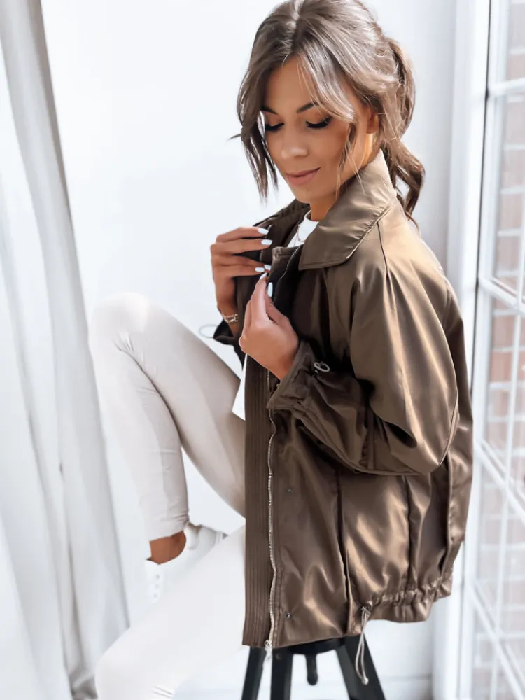 Stylowa kurtka o kroju oversize o dłuższym fasonie. Model posiada ściągacze na dole. Kurtka zapinana jest na zamek. Jest niezwykle lekka, dzięki czemu będzie idealna na ciepłe dni. Rękawy zakończone są ozdobnymi ściągaczami.