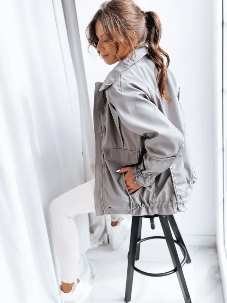 Stylowa kurtka o kroju oversize o dłuższym fasonie. Model posiada ściągacze na dole. Kurtka zapinana jest na zamek. Jest niezwykle lekka, dzięki czemu będzie idealna na ciepłe dni. Rękawy zakończone są ozdobnymi ściągaczami.