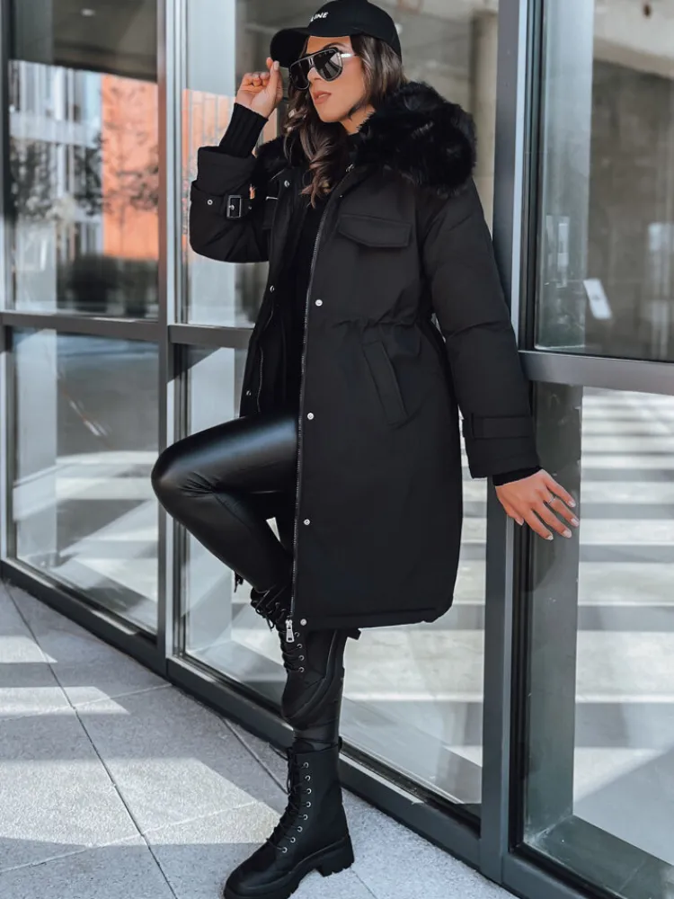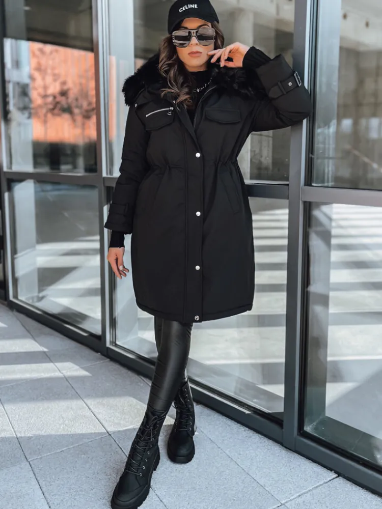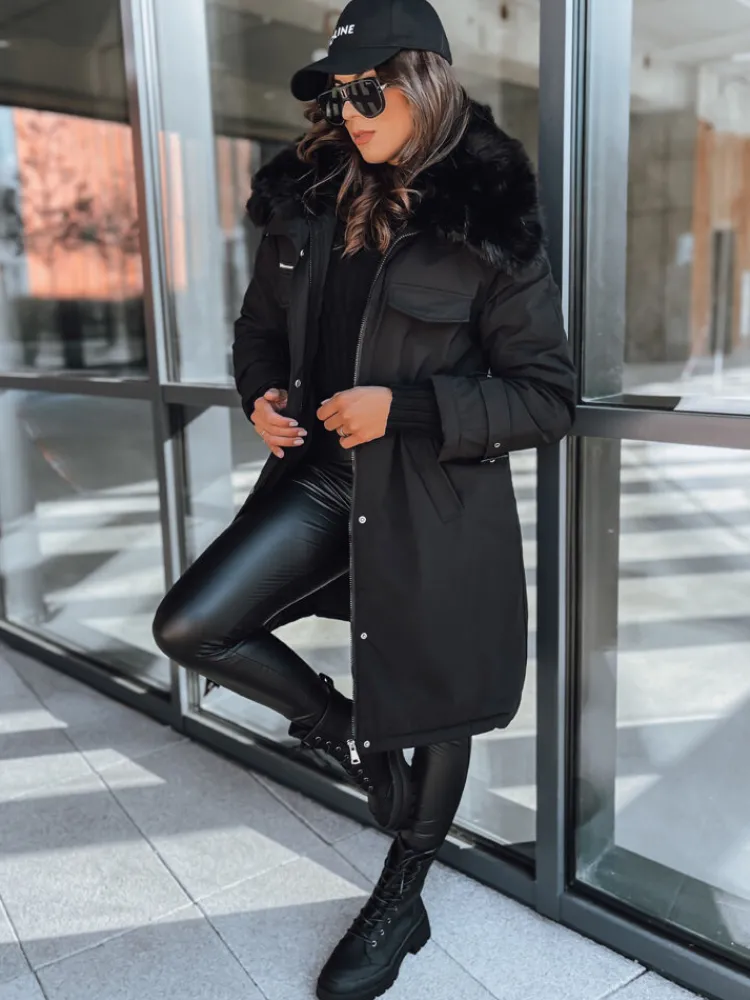 Parka o dłuższym fasonie to idealna propozycja dla kobiet ceniących styl i wygodę. Jej krój płaszczyka nada stylizacji eleganckiego charakteru. Model posiada niezwykle efektowny kołnierz z odpinanym futerkiem, ściągacz umiejscowiony w środku kurtki, dzięki któremu można pięknie podkreślić talię. Zapinana na suwak oraz napy. Dostępna w dwóch wersjach kolorystycznych. Model ten posiada podszewkę, która zapewni komfort w chłodne dni.
