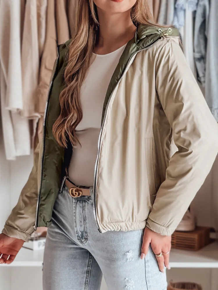 Dwustronna kurtka przejściowa łączy nowoczesność z modnym designem. Wygodny, odpinany kaptur i regulacja na dole zapewniają idealne dopasowanie. Dwie kieszenie zewnętrzne i dwie wewnętrzne dodają praktyczności. Uniwersalny fason sprawdzi się w codziennych stylizacjach, podkreślając nowoczesny look.