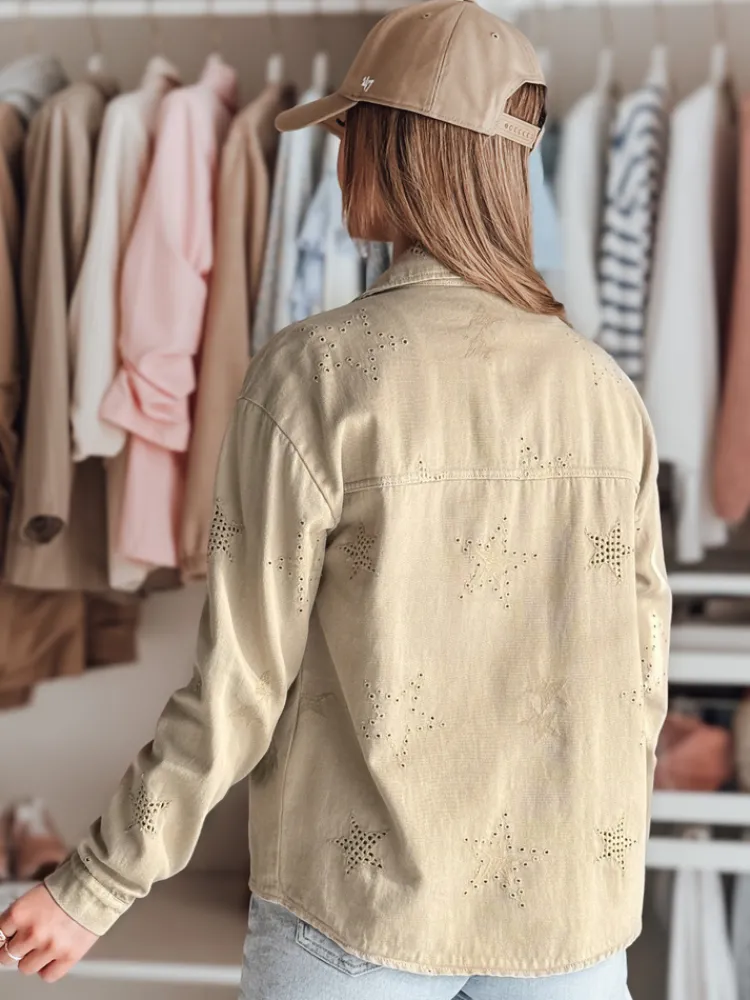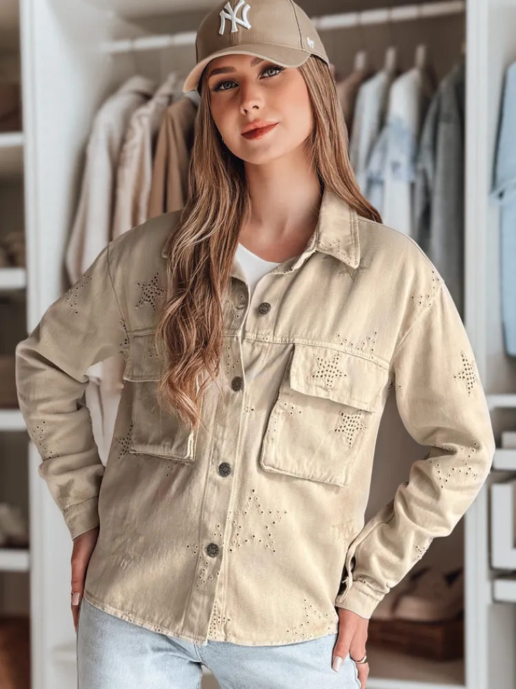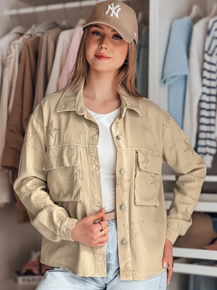 Kurtka damska o casualowym kroju, idealna na sezon przejściowy. Zapinana na guziki, z klasycznym kołnierzem i praktycznymi kieszeniami. Uniwersalny rozmiar pasuje od XS do L. Ozdobiona subtelnym motywem gwiazdek, które dodają jej unikalnego charakteru. Świetnie komponuje się zarówno z jeansami, jak i eleganckimi spodniami, tworząc stylowy look.
