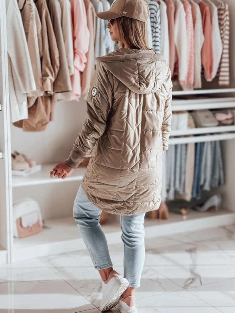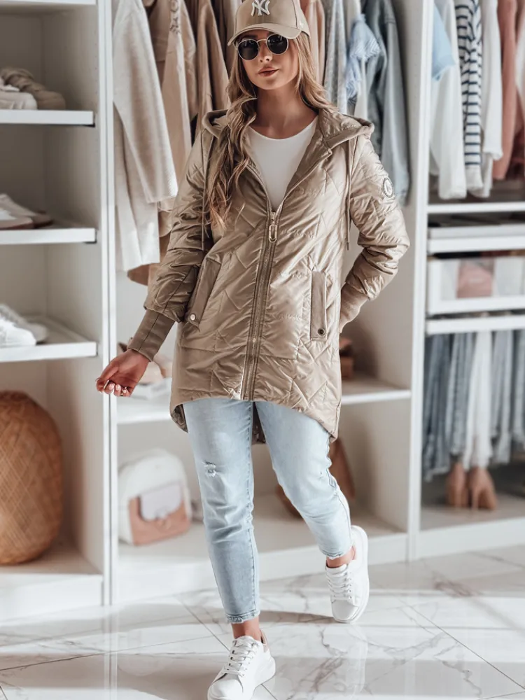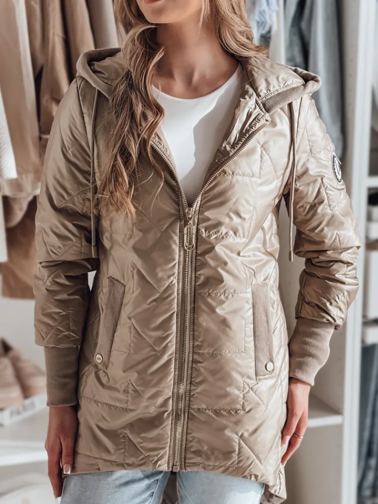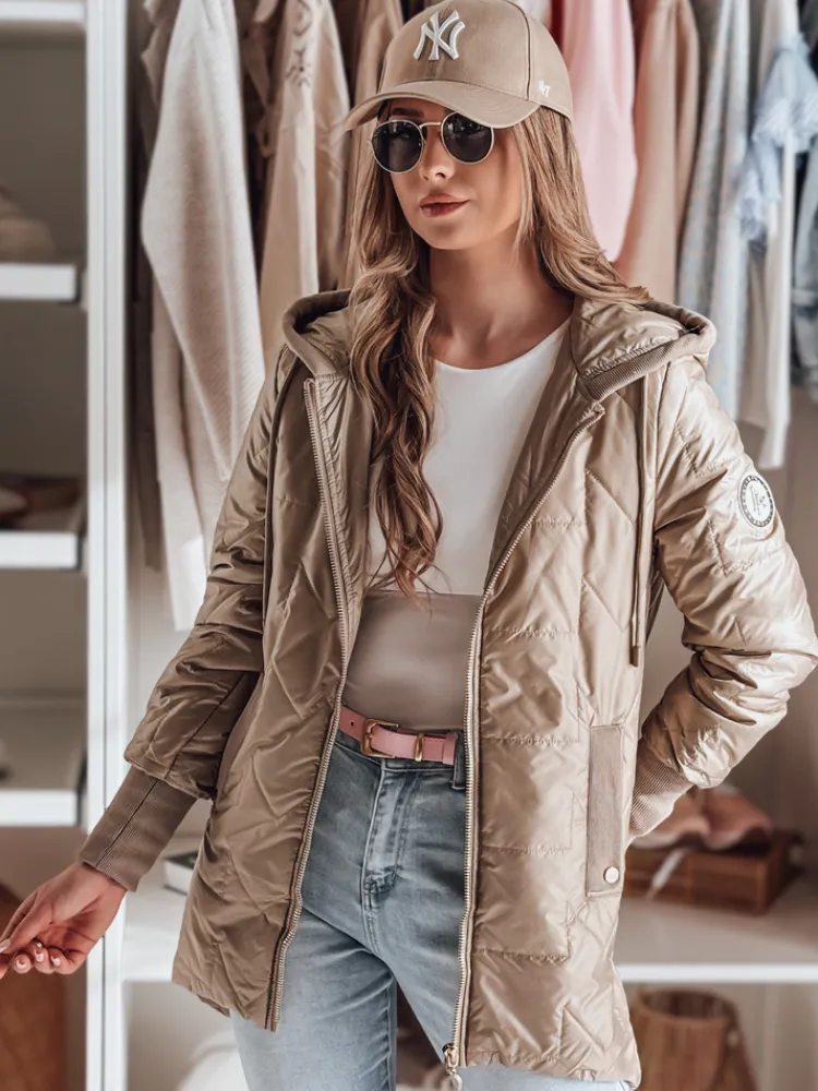 Lekka i ciepła kurtka przejściowa, idealna na zmienne warunki pogodowe. Wyposażona w kaptur z regulacją, dwie ozdobne kieszenie i wygodne zapinanie na zamek. Ściągacze przy rękawach chronią przed chłodem, a subtelne pikowanie podkreśla jej nowoczesny wygląd. Doskonały wybór dla kobiet ceniących styl i wygodę w codziennych stylizacjach.