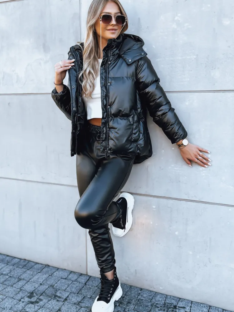 Pikowana kurtka z eko skóry to MUST HAVE w Twojej szafie. Model posiada nieodpinany kaptur oraz stójkę. Kurtka wykonana jest z woskowanego i odbijającego światło materiału. Rękawy zakończone są ściągaczami. Model zapinany na zamek i napy, dzięki czemu zapewni maximum ciepła.