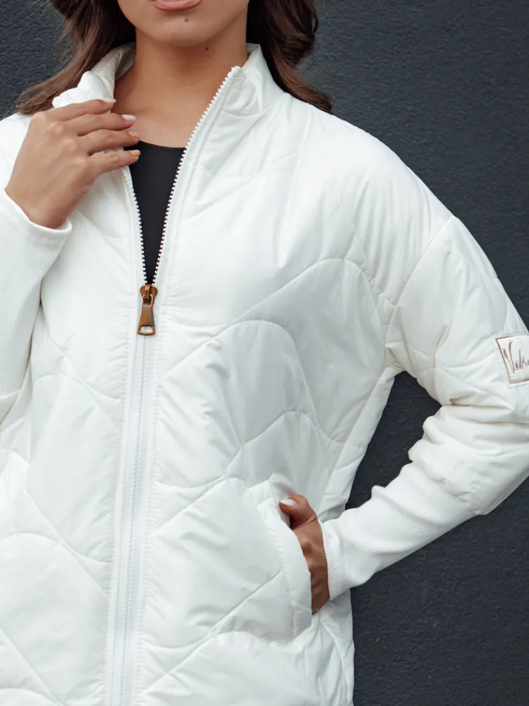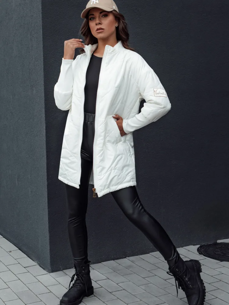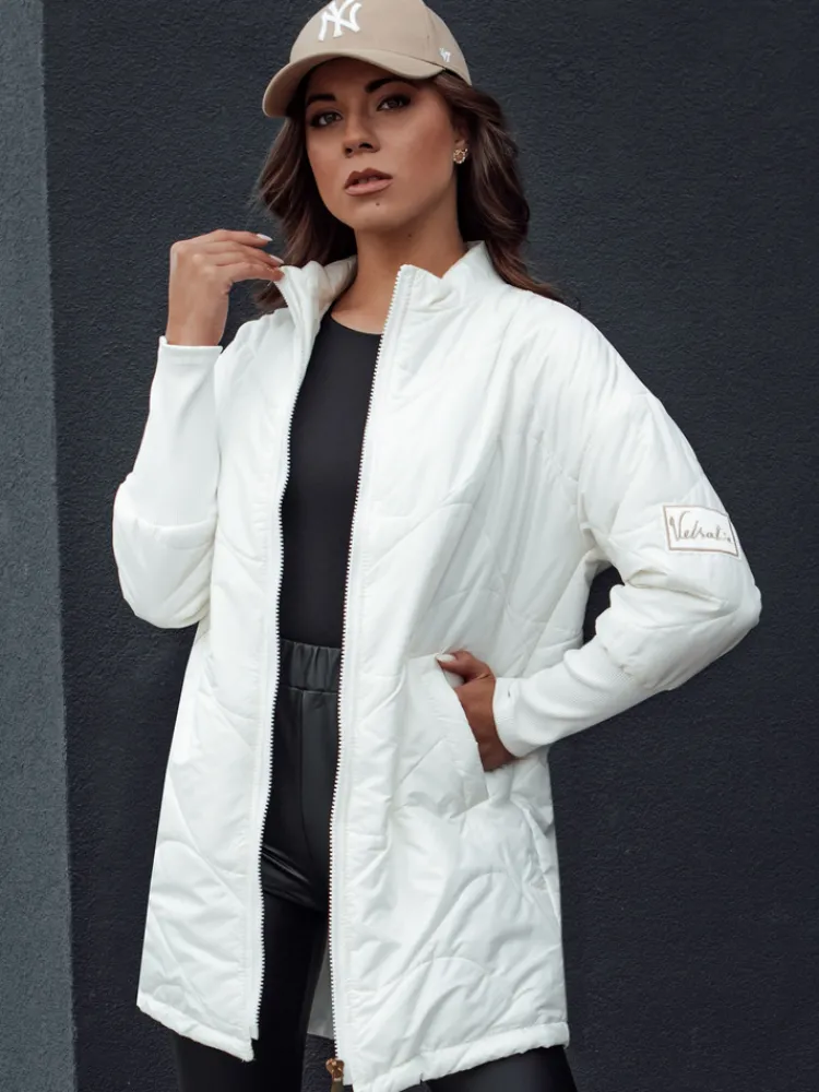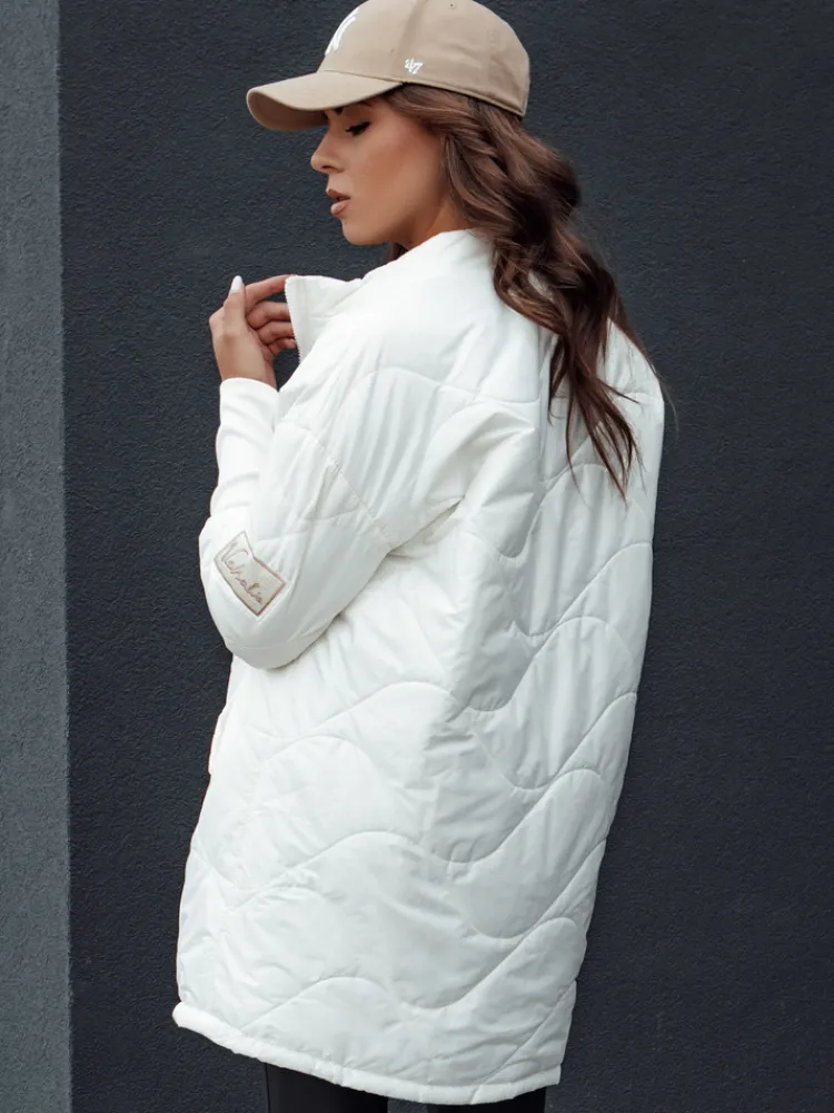 Pikowana kurtka ARANA to doskonały wybór na ten sezon! Model charakteryzuje się rękawami zakończonymi dłuższymi ściągaczami, które nadają całości efektownego wyglądu. Kieszenie są umiejscowione na wysokości talii, co dodaje praktyczności. Kurtka wykończona jest stójką i nie posiada kaptura, dzięki czemu świetnie sprawdzi się na chłodniejsze wieczory wiosną i latem.