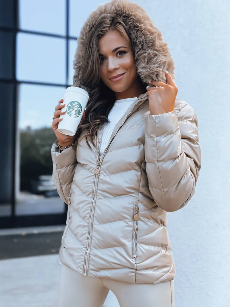 Pikowana kurtka z kapturem z połyskującego materiału, która wyróżni Cię z tłumu. Model jest taliowany, dzięki czemu pięknie podkreśla kobiece kształty. Kurtka posiada nieodpinany kaptur oraz odpinane futerko, dzięki czemu możemy z niej zrobić bardziej sportową lub elegancką wersję. Dostępna w kilku wersjach kolorystycznych.