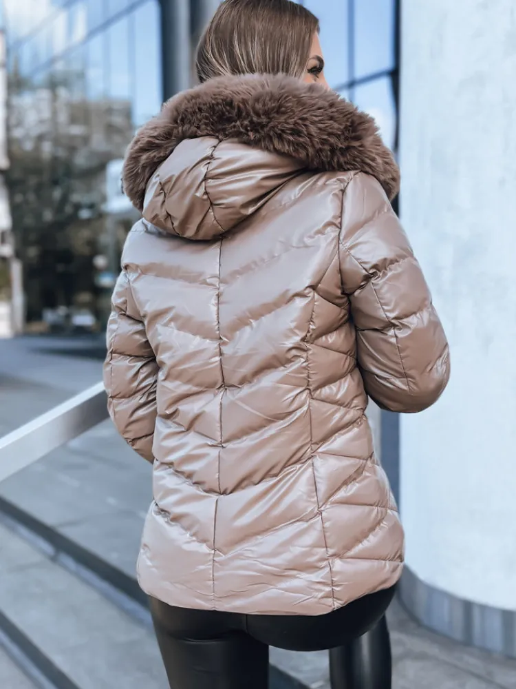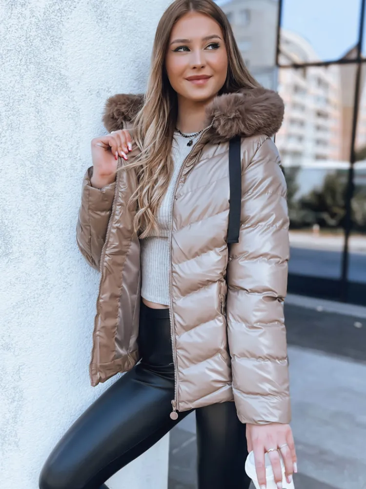 Pikowana kurtka z kapturem z połyskującego materiału, która wyróżni Cię z tłumu. Model jest taliowany, dzięki czemu pięknie podkreśla kobiece kształty. Kurtka posiada nieodpinany kaptur oraz odpinane futerko, dzięki czemu możemy z niej zrobić bardziej sportową lub elegancką wersję. Dostępna w kilku wersjach kolorystycznych.