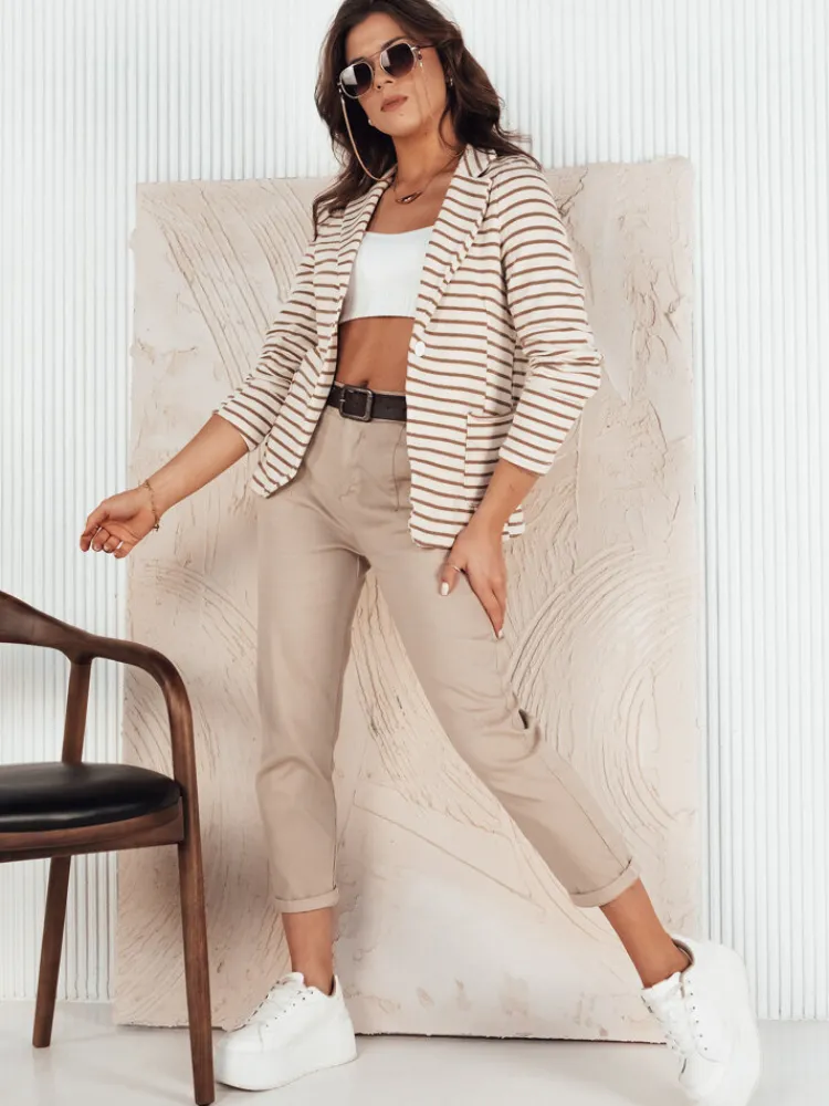 Marynarka COLLIN to elegancka interpretacja klasycznego stylu, idealna dla nowoczesnych kobiet ceniących sobie wyrafinowaną prostotę z modnym akcentem. Design z poziomymi paskami nadaje jej lekkości i świeżości, podczas gdy klasyczny kołnierz i funkcjonalne kieszenie zachowują tradycyjną elegancję. Doskonale sprawdzi się jako wykończenie zarówno biznesowych, jak i casualowych zestawów.