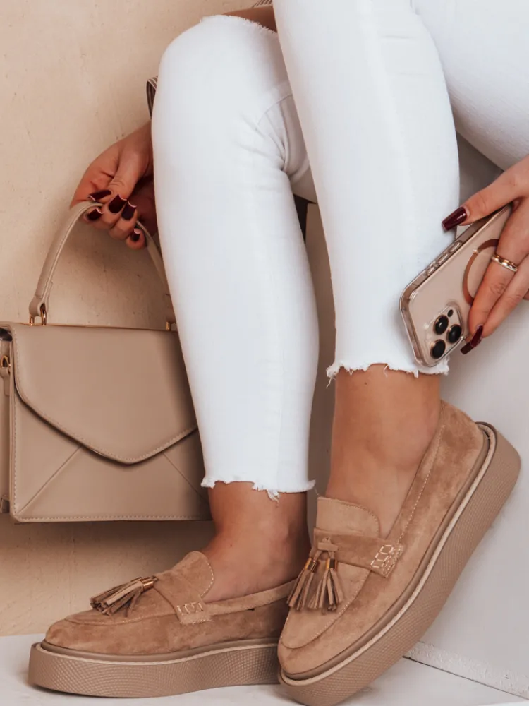 Półbuty damskie typu mokasyny na grubej platformie. Model jest wykonany z zamszowej eko skóry oraz eko skórzanej wkładki. Nosek jest zaokrąglony oraz posiada ozdobe w postaci frędzlów. Świetnie sprawdzą się zarówno w miejskich stylizacjach, jak i jako uzupełnienie casualowych outfitów.