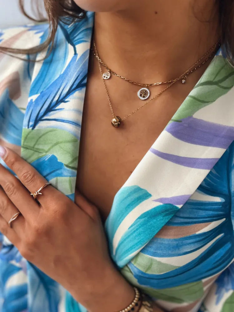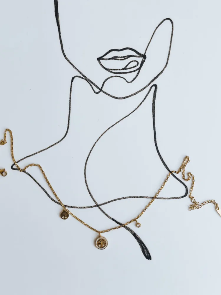 Niezwykle delikatna propozycja w złotym kolorze urozmaicona zawieszkami, spośród których głowa to ”drzewko szczęścia” otoczona malutkimi diamencikami. Posiada zapinanie z możliwością regulacji długości.