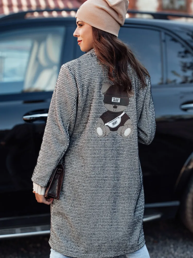 Stylowy płaszcz, który zachwyca nie tylko nowoczesnym krojem, ale także uroczym wzorem misia na plecach. To idealne połączenie miejskiego szyku z odrobiną zabawy, co sprawia, że wyróżnia się na tle innych. Wygodny fason zapewnia swobodę ruchu, a wysokiej jakości materiał daje uczucie komfortu nawet w chłodne dni. Idealny do codziennych stylizacji.