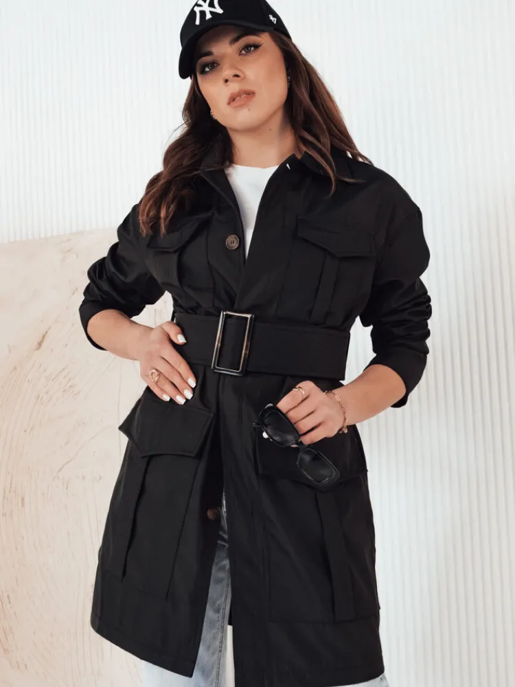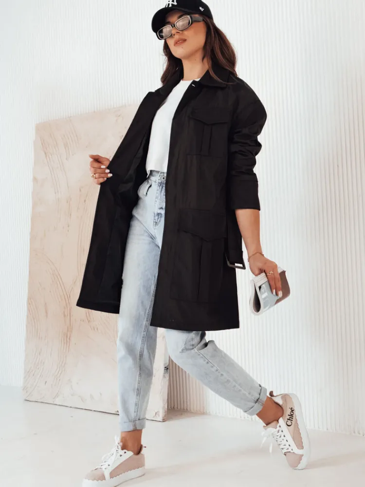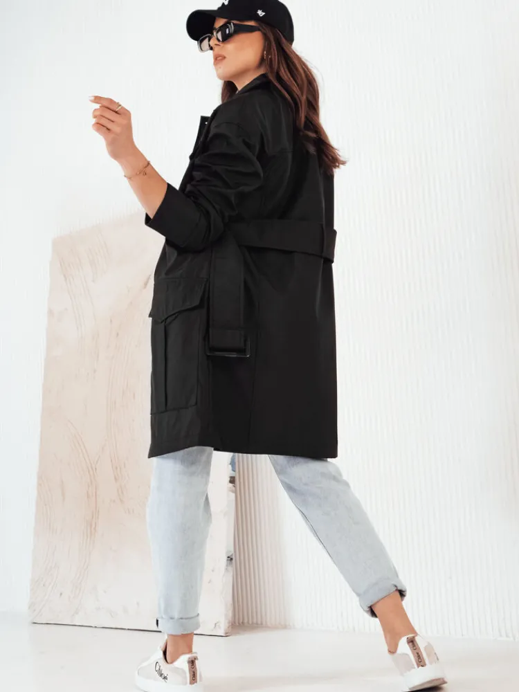 Bardzo stylowy płaszcz o prostym kroju. Zapinany na guziki. Model posiada pasek, który pięknie podkreśla talię. Świetnie się układa i prezentuje. Pasuje do codziennych i eleganckich stylizacji.