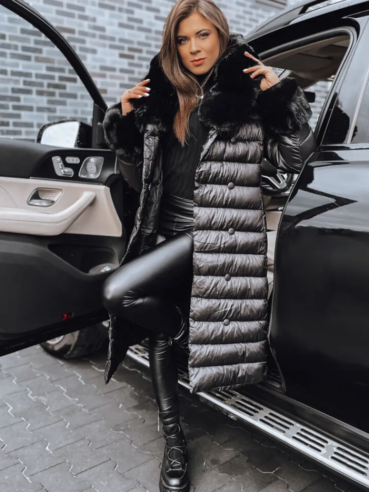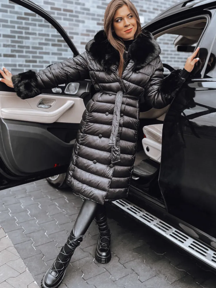 Pikowany płaszcz o dłuższym fasonie to niezbędnik w szafie każdej stylowej kobiety. Posiada efektownie wyglądający kołnierz z nieodpinanym futerkiem oraz rękawy również zakończone futerkiem, które można odpiąć. W pasie znajduje się pasek , którym można podkreślić talie, nadając całości eleganckiego wyglądu. Dodatkowy element ozdobny stanowi dwurzędowe zapinanie na guziki. Wypełniony został puchem syntetycznym, dzięki czemu jest ciepły i jednocześnie bardzo lekki. Idealnie dopełni wiele stylizacji.