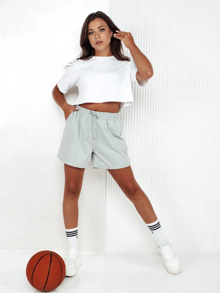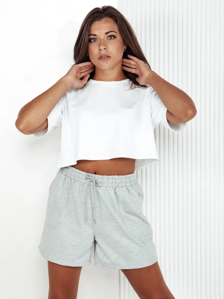 Krótkie spodenki damskie z kieszeniami po bokach. Model idealnie sprawdzi się do sportowych stylizacji. Gumka na górze świetnie dopasowuje się do sylwetki. Spodenki posiadają sznureczki w pasie, dzięki czemu można regulować ich szerokość.