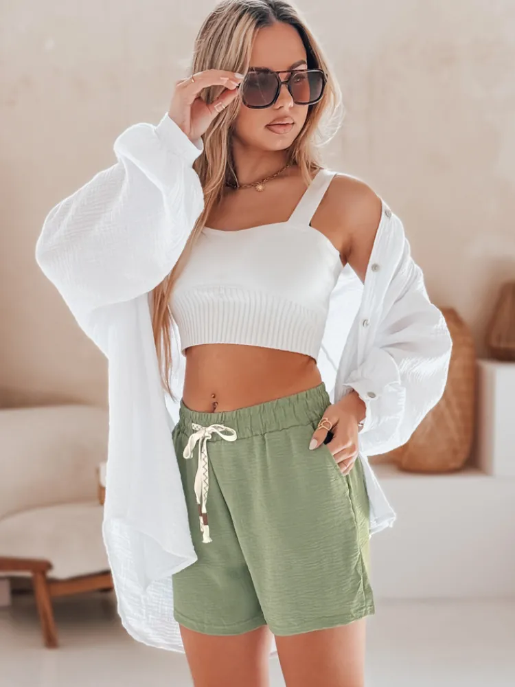 Spodenki damskie z materiału o delikatnej fakturze zachwycają prostotą i wakacyjnym klimatem. Wysoki stan oraz elastyczny pas gwarantują wygodę, a ozdobny sznurek dodaje całości oryginalnego charakteru. Uniwersalny fason świetnie komponuje się z topami, koszulami i sandałami. To model, który z łatwością można dopasować do codziennych stylizacji na lato.