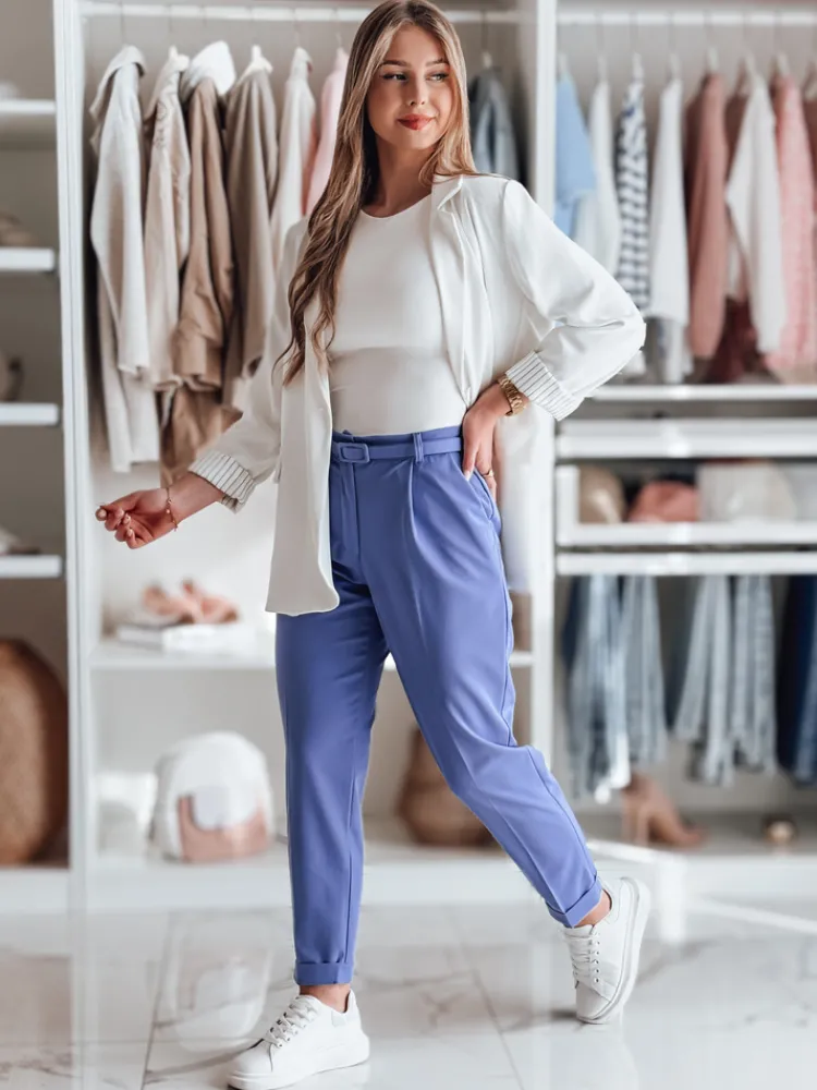Klasyczne spodnie damskie w casualowym wydaniu. Wysoki stan i plisowania optycznie wysmuklają sylwetkę, a pasek w komplecie dopełnia całość. Zapinane na guzik i zamek, z kieszeniami dla większej wygody. Sprawdzą się zarówno w pracy, jak i podczas spotkań towarzyskich.