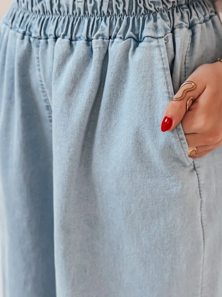 Luźne jeansowe spodnie z szerokimi nogawkami i elastycznym pasem to must-have wiosennej garderoby. Model wykonany z miękkiego materiału oferuje komfort noszenia przez cały dzień. Sprawdzi się zarówno w codziennych stylizacjach, jak i w zestawie z t-shirtem czy topem na cieplejsze dni.