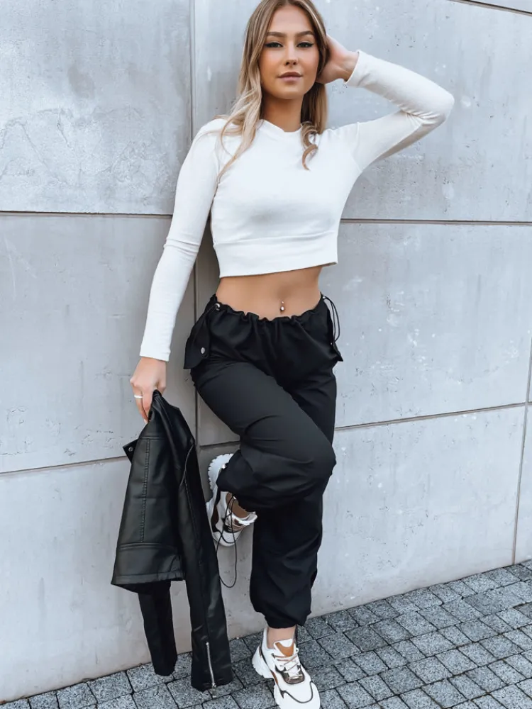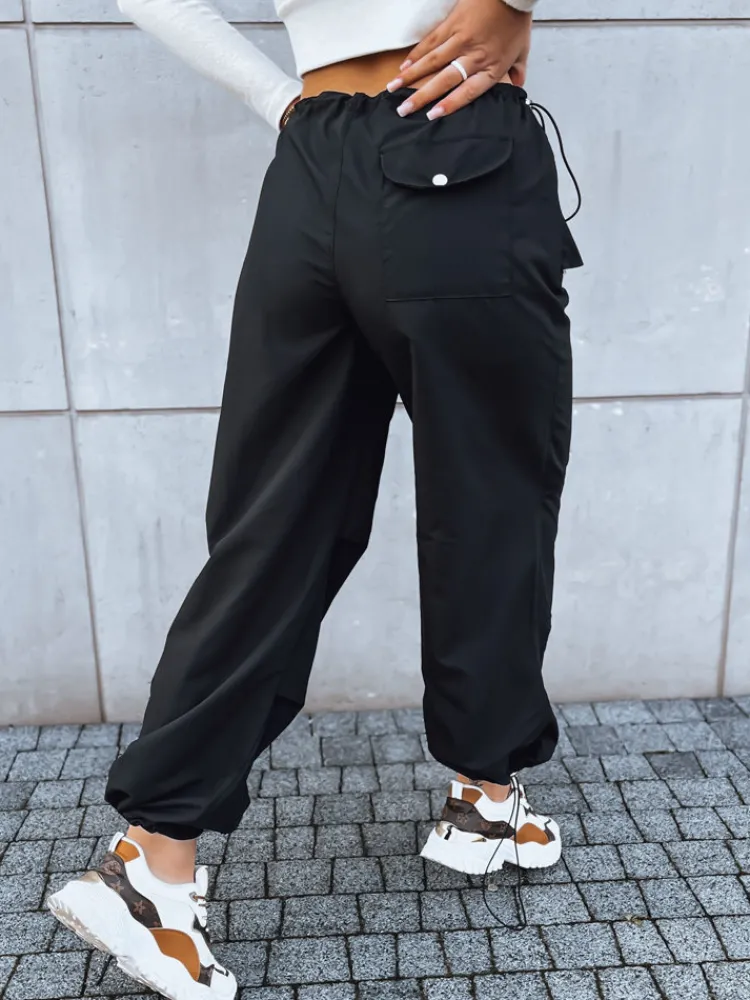 - Zakończenie na ściągacze: Dolna część spodni z ściągaczami pozwala na uzyskanie charakterystycznego dla nich efektu spadochronowego.