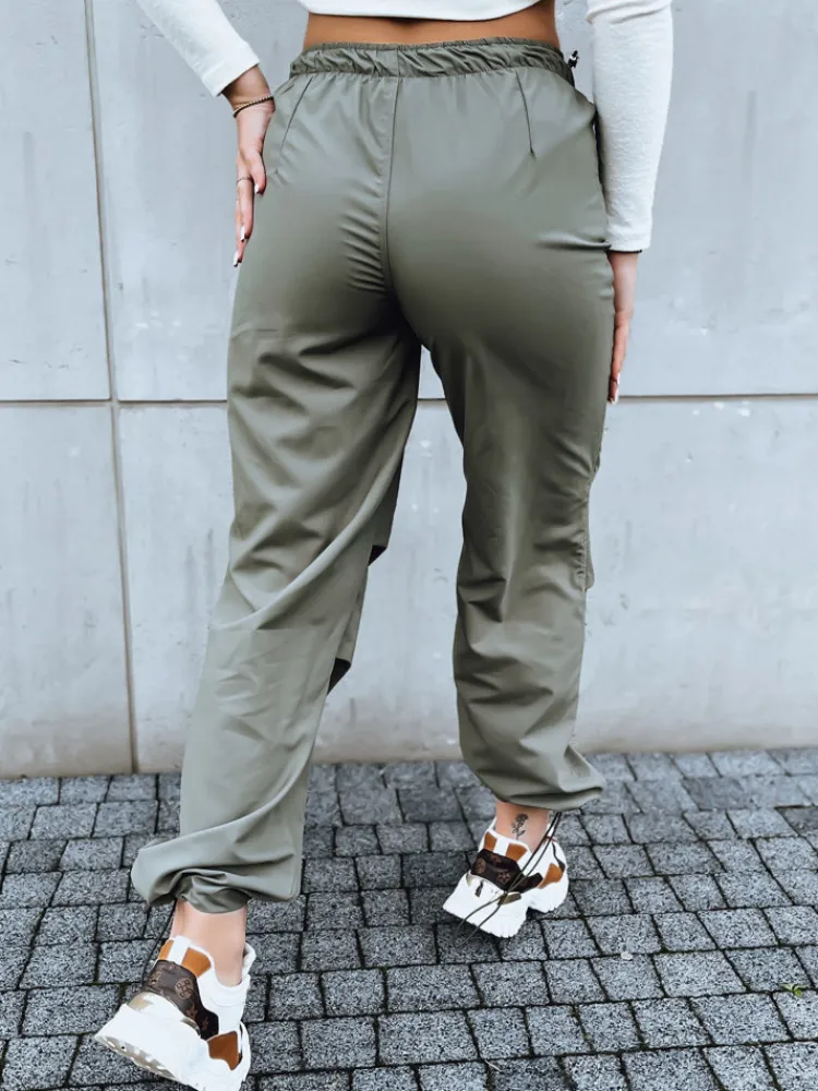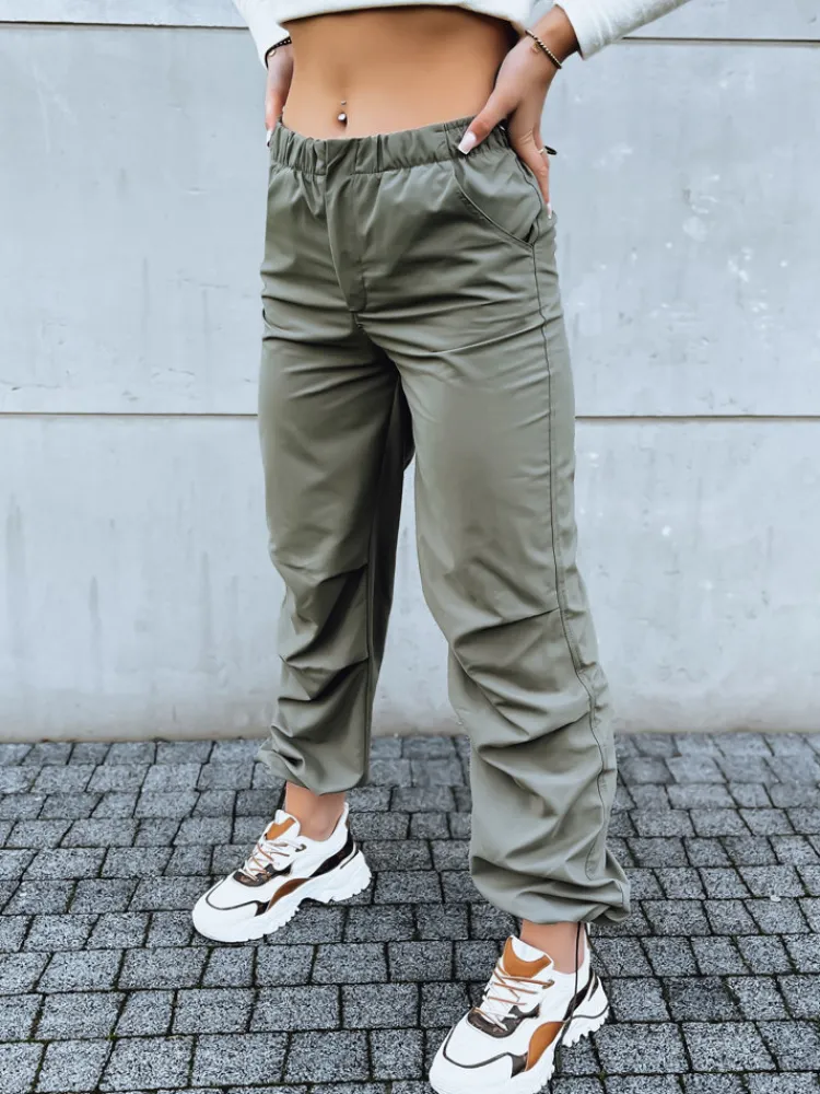 Spodnie typu parachute. Ściągacze w talii umożliwiają maksymalne dopasowanie do sylwetki. Model zapinany na zatrzask i suwak. Dół również zakończony jest ściągaczami, dzięki czemu możemy uzyskać pożądany wygląd spodni. Model dostępny w kilku wersjach kolorystycznych.