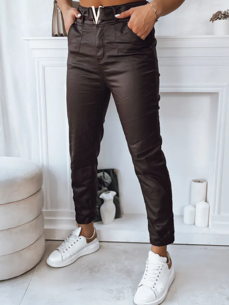 Podkreśl swój styl tymi wyjątkowymi spodniami z imitacji skóry. Ozdobny pasek z charakterystyczną klamrą dodaje im odrobiny ekstrawagancji, a jednocześnie podkreśla talię, tworząc efektowny efekt. Idealne do noszenia na co dzień lub jako element wieczorowego outfitu.