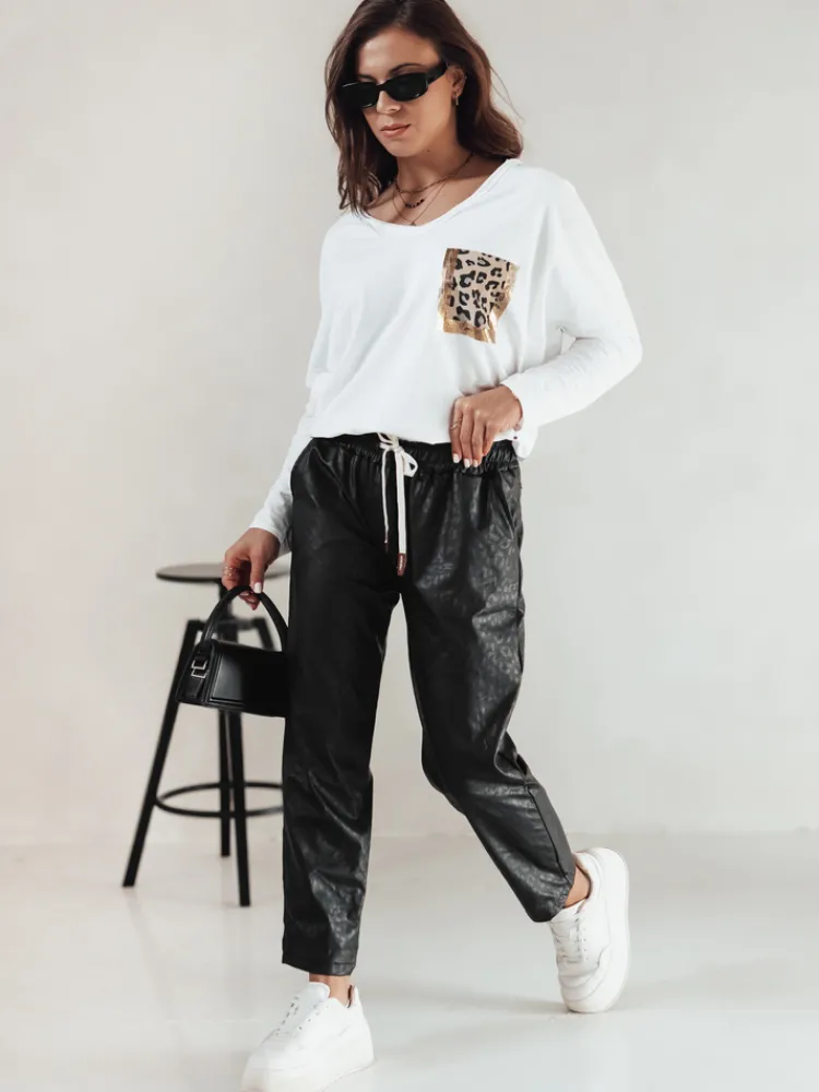 Spodnie o nowoczesnym fasonie wykonane z materiału imitującego skórę, które łączą styl z funkcjonalnością. Elastyczna talia z wiązaniem zapewnia wygodę, a modne detale nadają całości wyjątkowego charakteru. Idealne na codzienne wyjścia lub wieczorne spotkania.