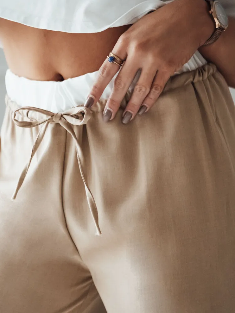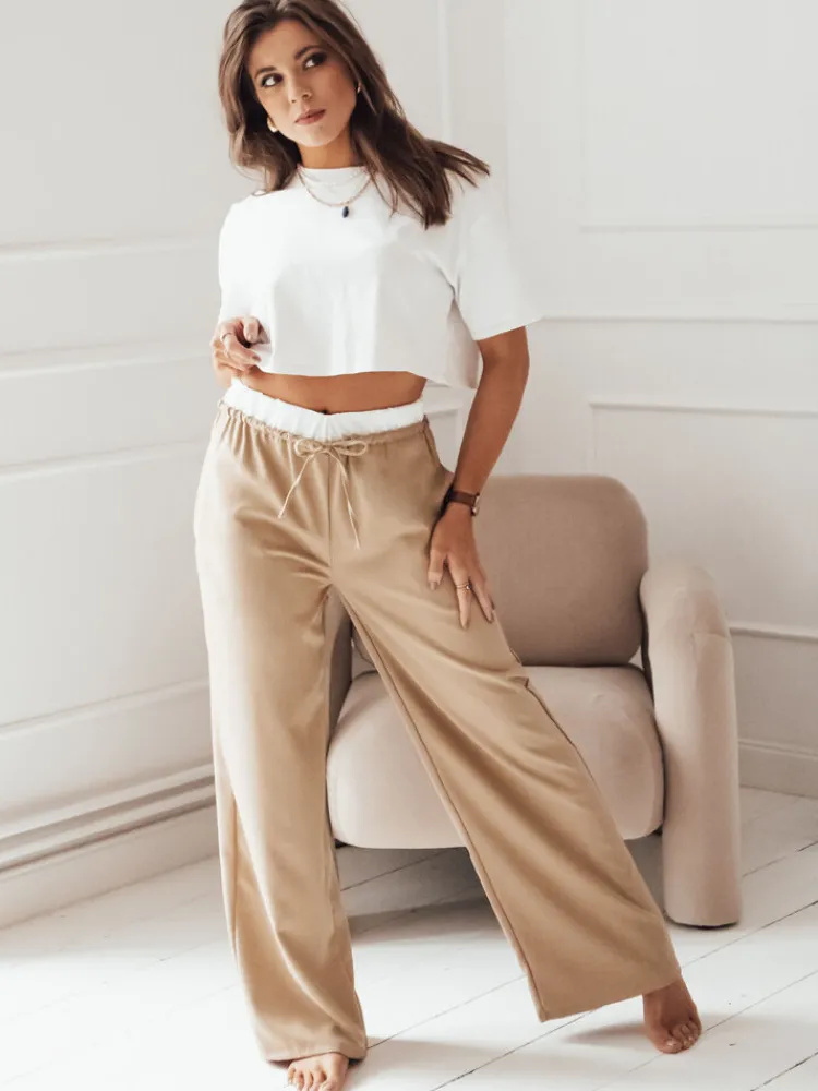 Materiałowe spodnie o najmodniejszym fasonie wide leg to niezbędnik, jeśli chodzi o tworzenie stylizacji w nadchodzącym sezonie. Posiadają dwie kieszenie, wyższy stan, wiązanie oraz ozdobną gumkę w pasie. Pasować będą na każdy typ figury. Dostępne w czterech kolorach.