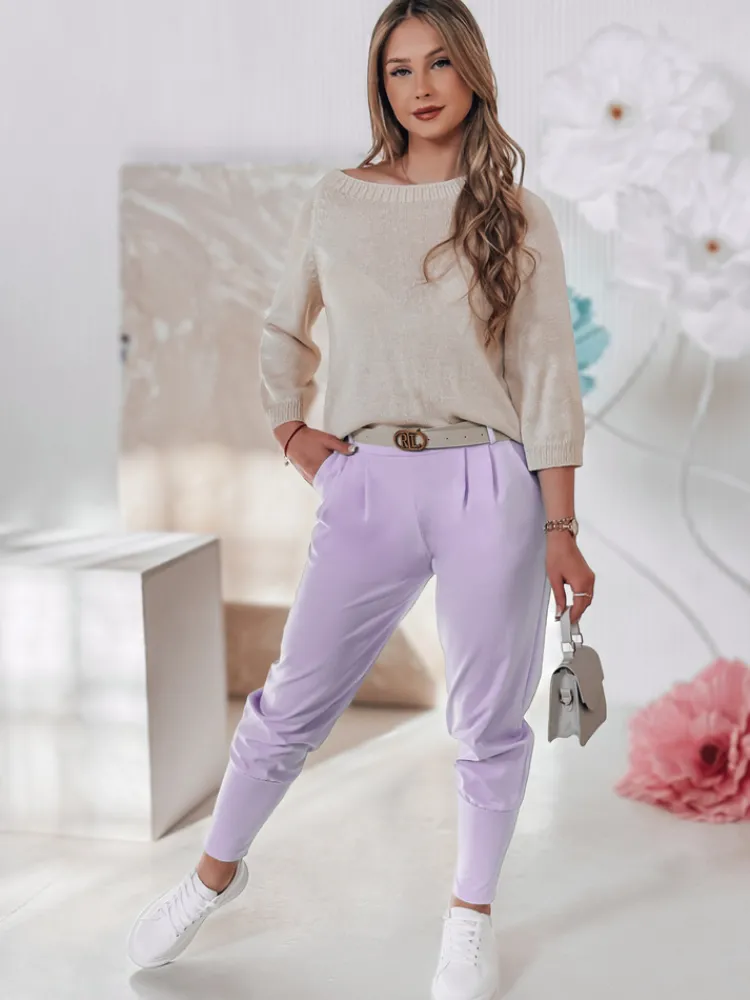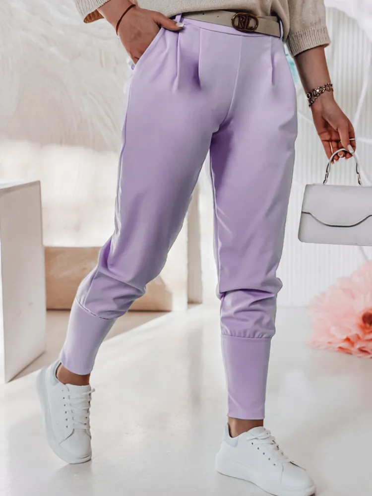 Damskie spodnie materiałowe o klasycznym fasonie, które łączą elegancję i wygodę. Posiadają elastyczną gumkę w pasie oraz zwężane nogawki zakończone ściągaczem, co zapewnia doskonałe dopasowanie. Uniwersalny rozmiar pasuje od XS do L. W zestawie znajduje się pasek podkreślający talię. Idealne do casualowych i bardziej eleganckich stylizacji.