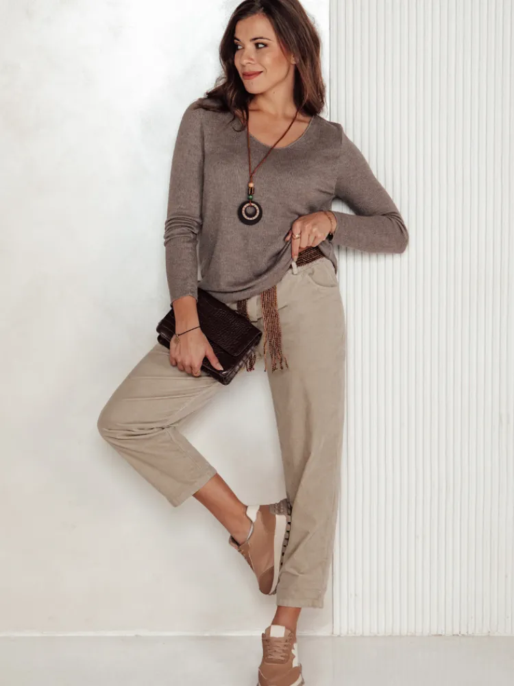 Sztruksowe spodnie z oryginalnym, wiązanym paskiem to propozycja dla miłośniczek stylowego komfortu. Miękka tkanina i swobodny krój sprawiają, że noszenie ich to czysta przyjemność. Idealne do codziennych stylizacji, stanowią doskonałe uzupełnienie garderoby każdej kobiety, która ceni sobie wygodę połączoną z elegancją.