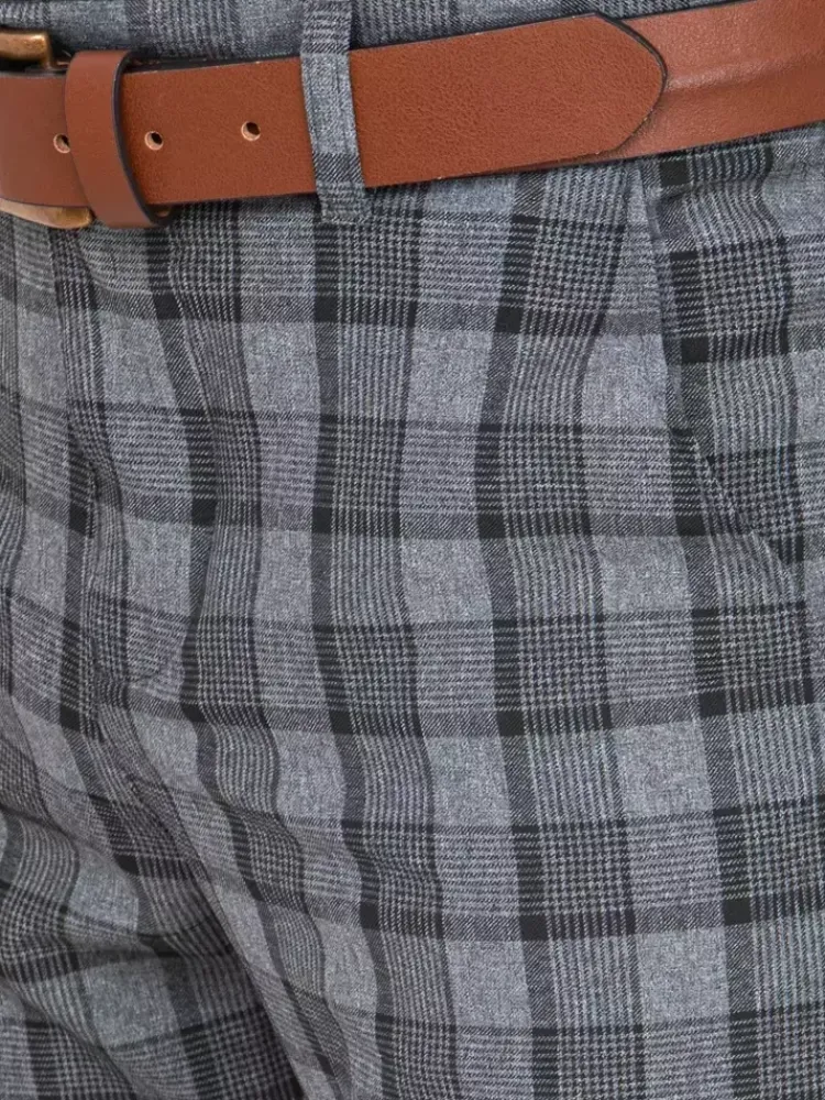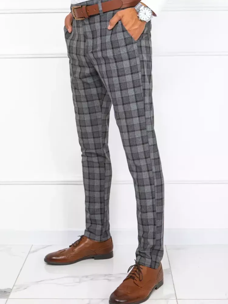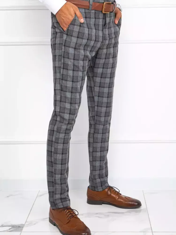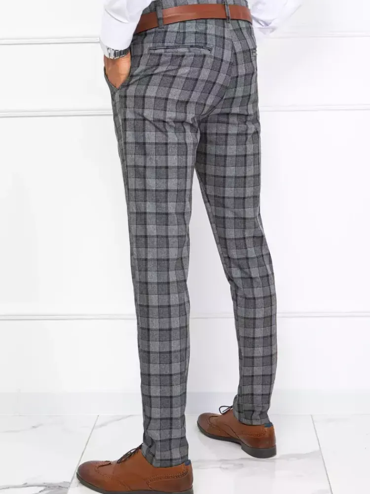 - Męskie spodnie materiałowe typu chinos w kratę.