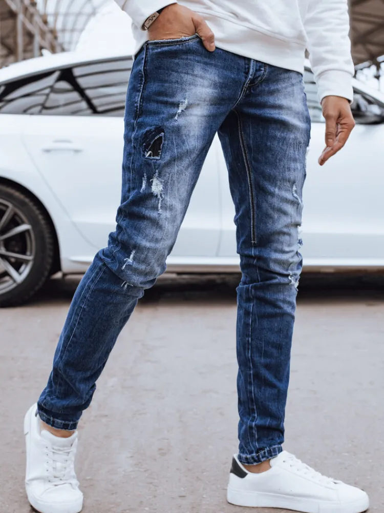 Rewelacyjne męskie spodnie jeansowe.Wykonane z przyjemnego w dotyku materiału.Zapinane na guziki.Modne dziury oraz prz…