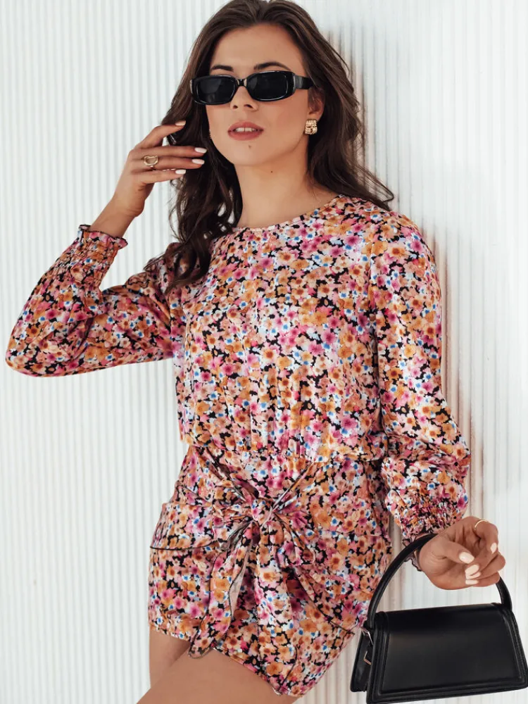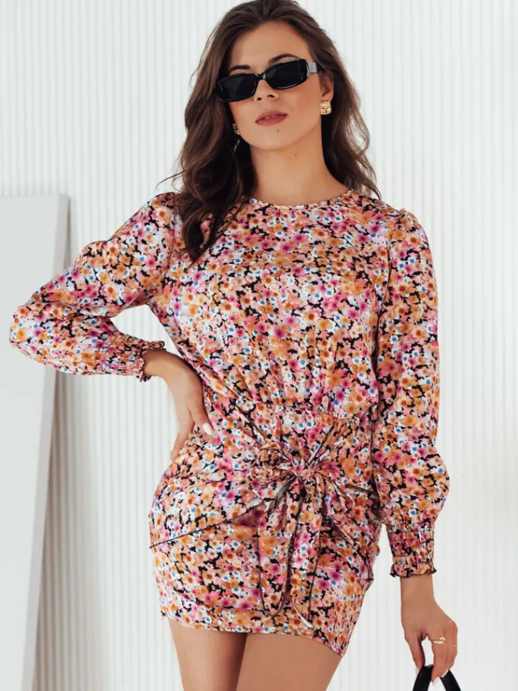 Niezwykle pełna uroku sukienka o bardzo ciekawym kroju. Górna część sukienki jest luźniejsza, dolna zaś obcisła. Na dolnej części sukienki znajduje się bardzo efektowne wiązanie, które możesz nosić jak lubisz, zawiązane na pętelkę lub kokardę. Rękawy wykończone są ściągaczem. Całość wygląda niezwykle kobieco i stylowo.