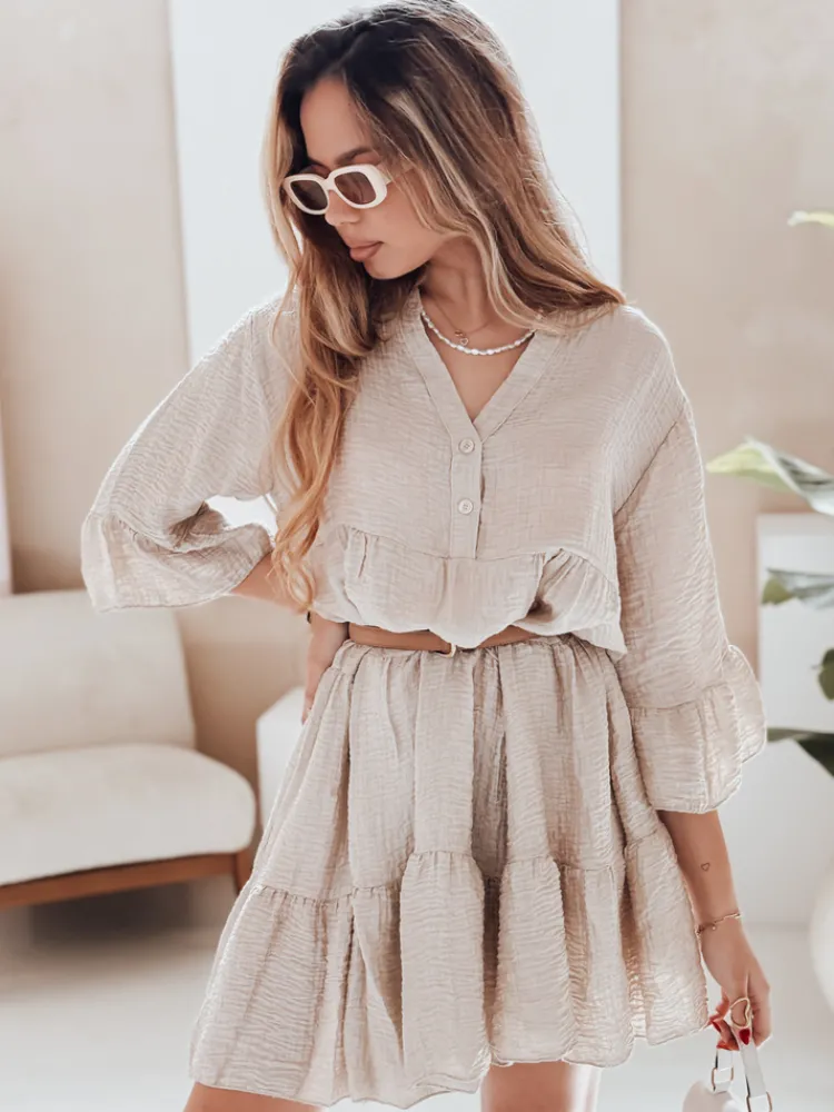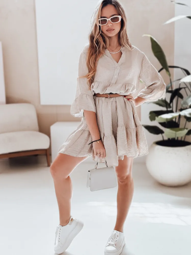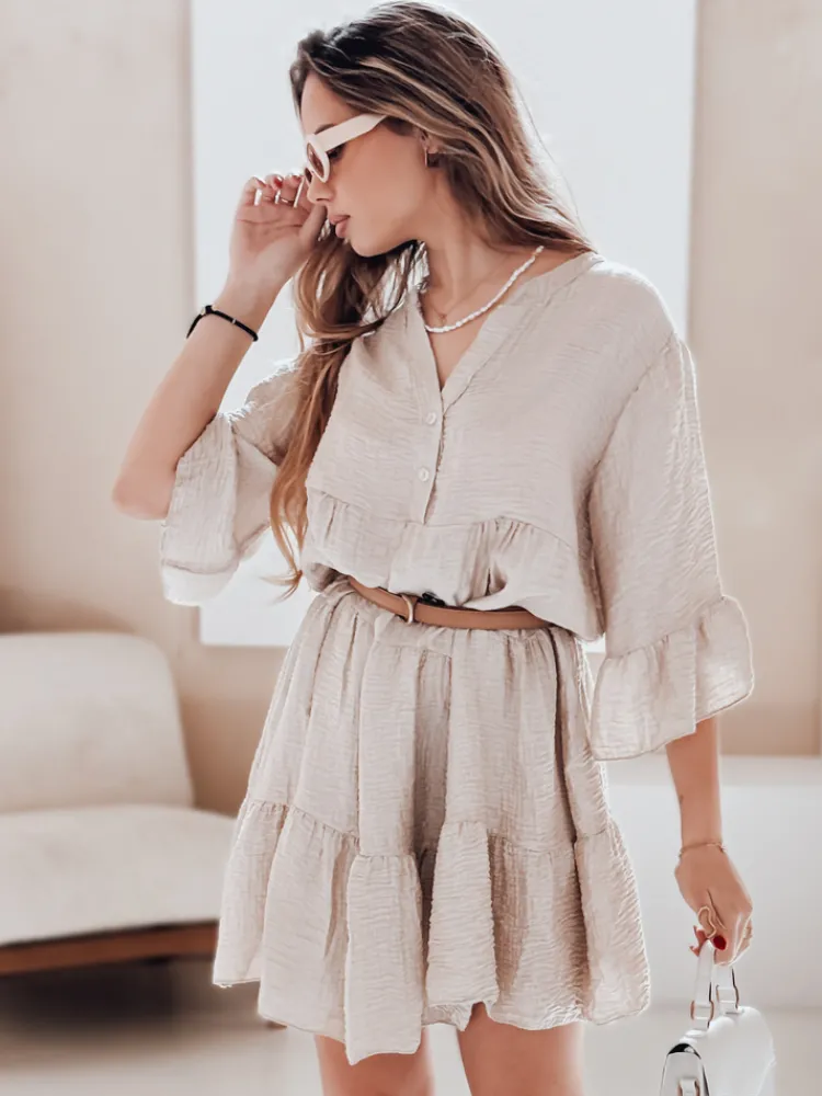 Letnia sukienka wykonana z tencelu zachwyca lekkością i naturalną strukturą materiału. Model z falbaną, rękawem ¾ i guzikami przy dekolcie świetnie sprawdzi się w codziennych, casualowych stylizacjach. Idealna do noszenia solo lub z paskiem w talii.