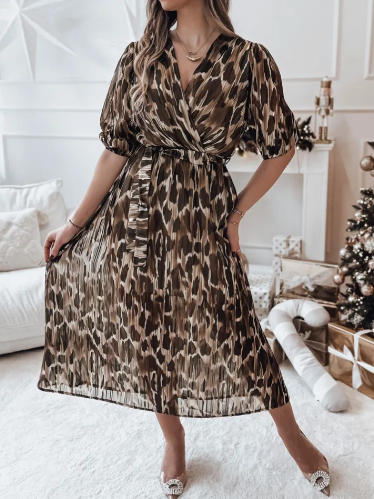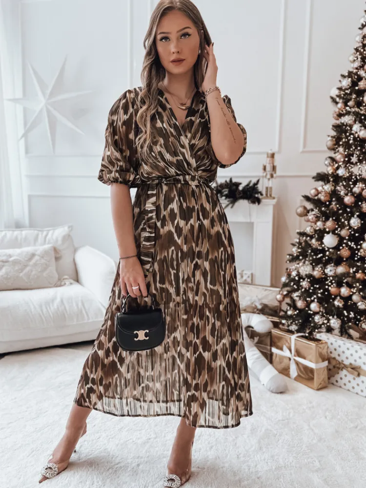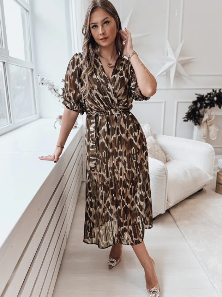 Elegancka sukienka midi o delikatnym wzorze inspirowanym naturą. Jej zwiewny materiał i kobiecy krój doskonale podkreślają sylwetkę, nadając całości lekkości i finezji. Sukienka idealna na wieczorne wyjścia oraz specjalne okazje, gdy chcesz poczuć się wyjątkowo. Dzięki unikalnemu printowi zyskasz stylowy wygląd, który przyciągnie uwagę. Pasek subtelnie podkreśla talię, nadając kreacji charakteru. Wybór idealny na każdy sezon.