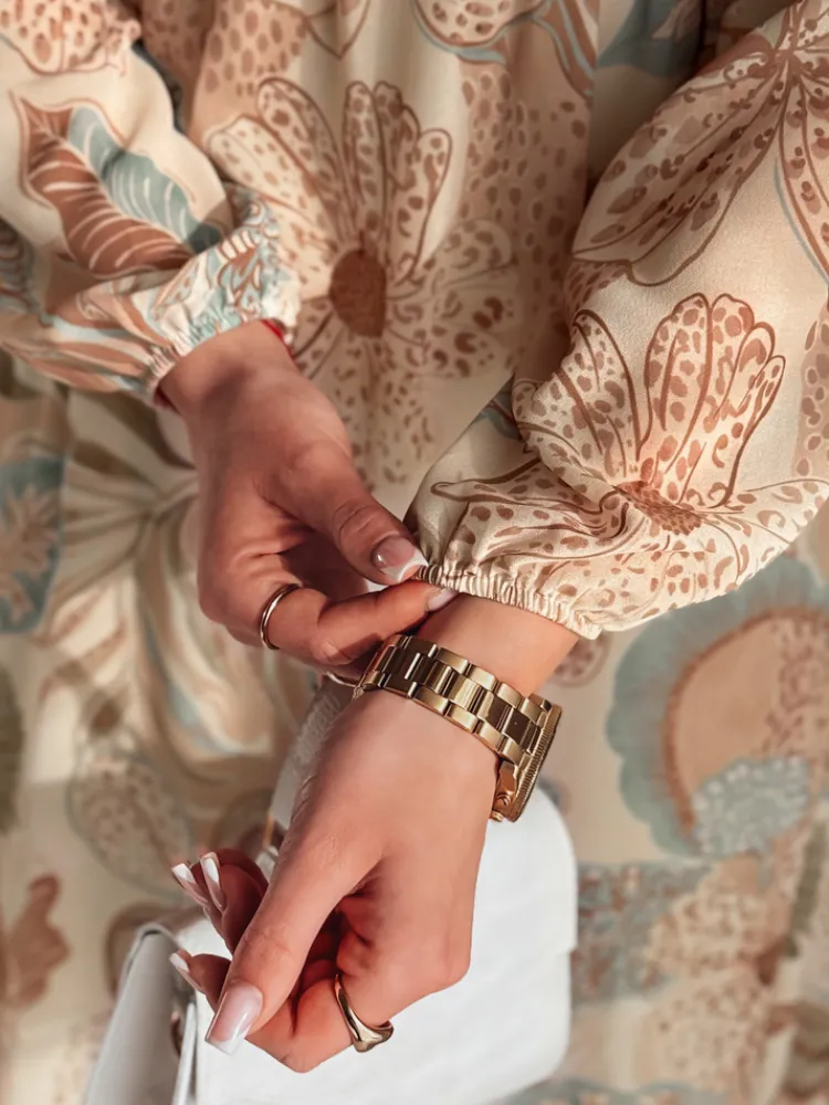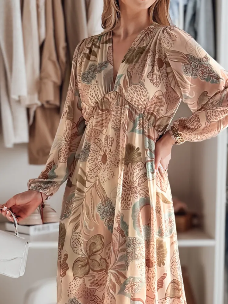 Lekka sukienka maxi o zwiewnym kroju, idealna na ciepłe dni. Gumka powyżej talii podkreśla sylwetkę, a długi rękaw zakończony elastycznym mankietem dodaje lekkości. Dekolt w serek subtelnie eksponuje szyję. Uniwersalny rozmiar pasuje od XS do XL. Kwiatowy nadruk wprowadza romantyczny akcent, czyniąc ten model świetnym wyborem zarówno na codzienne wyjścia, jak i eleganckie okazje.