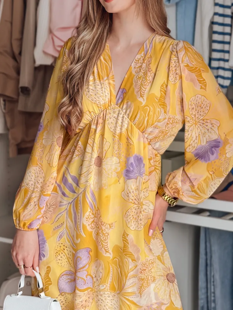 Lekka sukienka maxi o zwiewnym kroju, idealna na ciepłe dni. Gumka powyżej talii podkreśla sylwetkę, a długi rękaw zakończony elastycznym mankietem dodaje lekkości. Dekolt w serek subtelnie eksponuje szyję. Uniwersalny rozmiar pasuje od XS do XL. Kwiatowy nadruk wprowadza romantyczny akcent, czyniąc ten model świetnym wyborem zarówno na codzienne wyjścia, jak i eleganckie okazje.