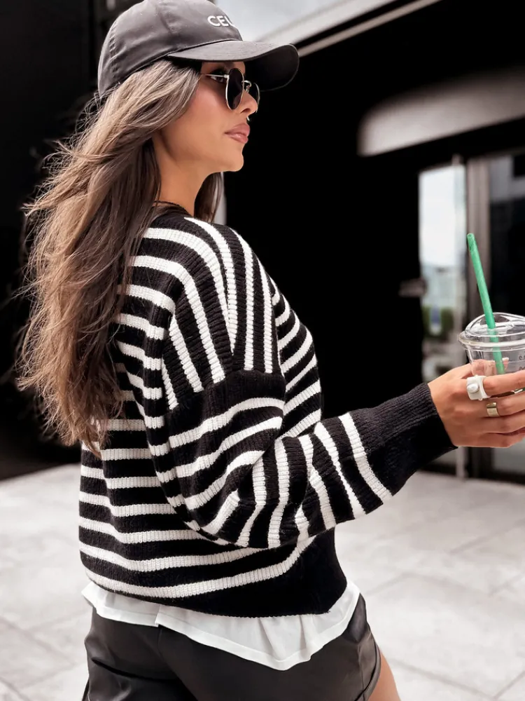Sweter BREEZY to doskonała propozycja na jesień! Posiada długi rękaw i dłuższy krój, co gwarantuje wyjątkowy komfort noszenia. Jego ponadczasowe paski nadają stylizacji charakteru, a dekolt w serek podkreśla szyję. Dodatkowo, sweter jest zapinany na stylowe guziki, co dodaje mu elegancji. To idealny wybór na chłodniejsze jesienne dni.