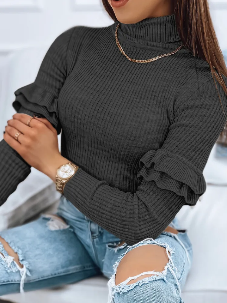 Sweterek BUFALO to delikatny golfik, wykonanie z prążkowanej, miłej w dotyku tkaniny oraz minimalistyczny design to cechy charakteryzujące ten model. Sweterek urozmaicają ozdobne falbany znajdujące się na rękawach. Stworzysz z nim look codzienny jak i na bardziej wymagające okoliczności. Dostępny w wielu kolorach.