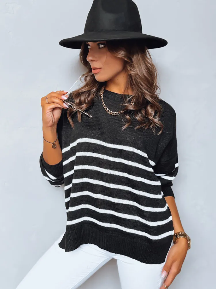 Sweter SEWERUS to połączenie oversizowego kroju i ponadczasowych pasków co czyni go idealnym wyborem na ten sezon. Model ten wyróżnia się stylowymi rozcięciami po bokach, które dodają mu oryginalności. Tył swetra jest nieco dłuższy od przodu. To doskonała propozycja do jesiennych stylizacji.