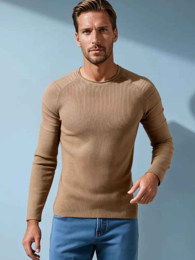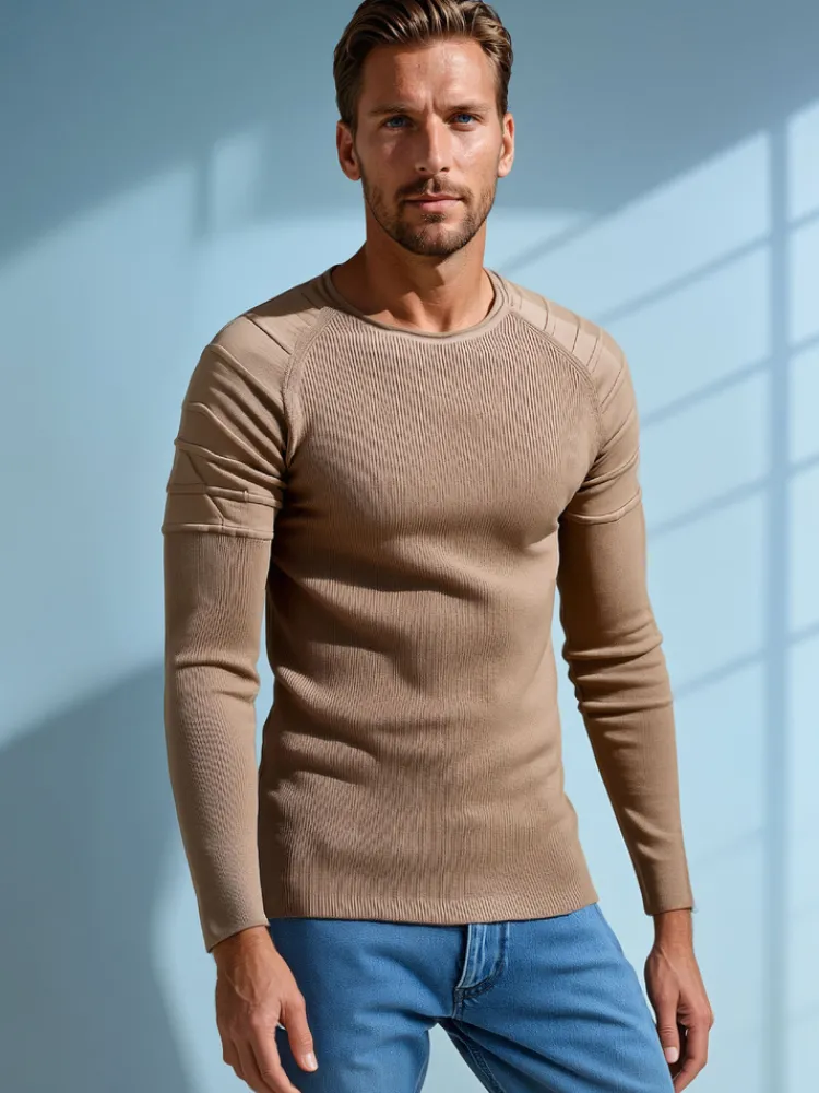 Stylowy sweter męski, który podkreśla elegancję i uniwersalność. Wykonany z wysokiej jakości dzianiny, łączy w sobie klasyczny krój i nowoczesne wykończenie. Subtelne przeszycia na ramionach dodają charakteru, a miękka, elastyczna tkanina zapewnia wygodę noszenia przez cały dzień. Idealny do codziennych stylizacji z jeansami lub eleganckich zestawów z chinosami..